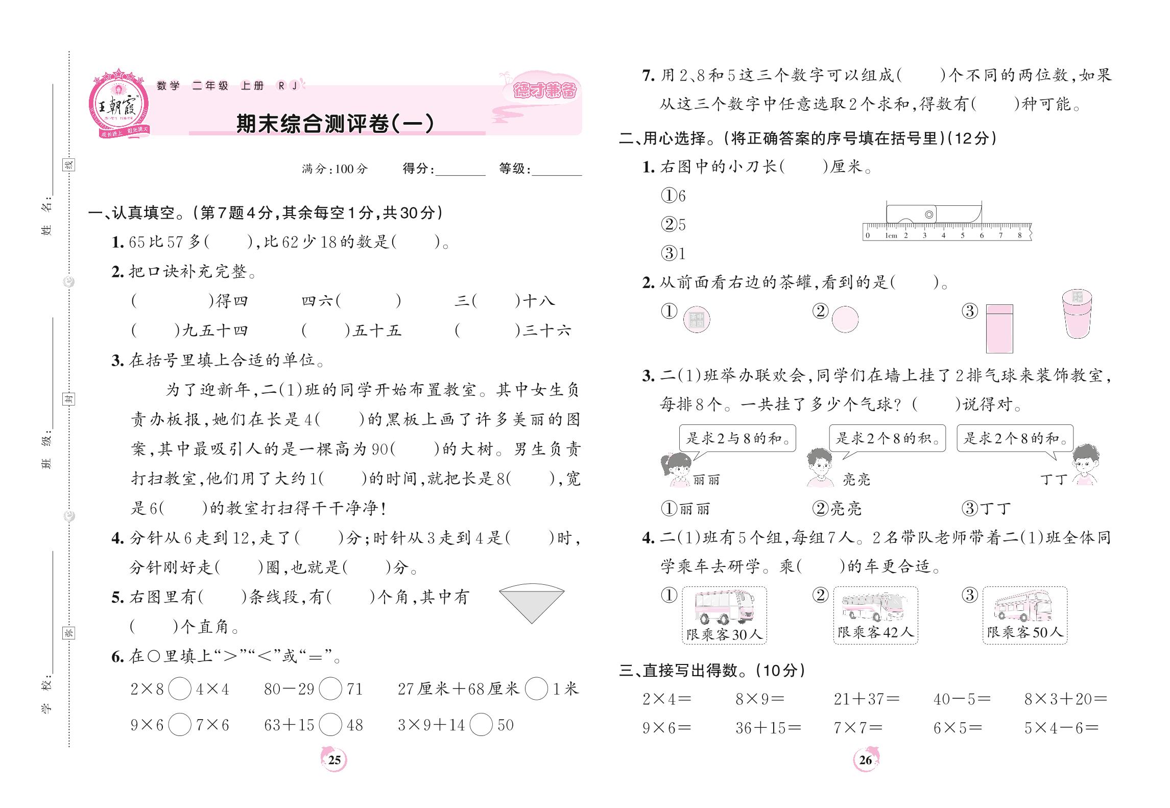 2022上册二年级数学人教版 期末综合测评卷(一)