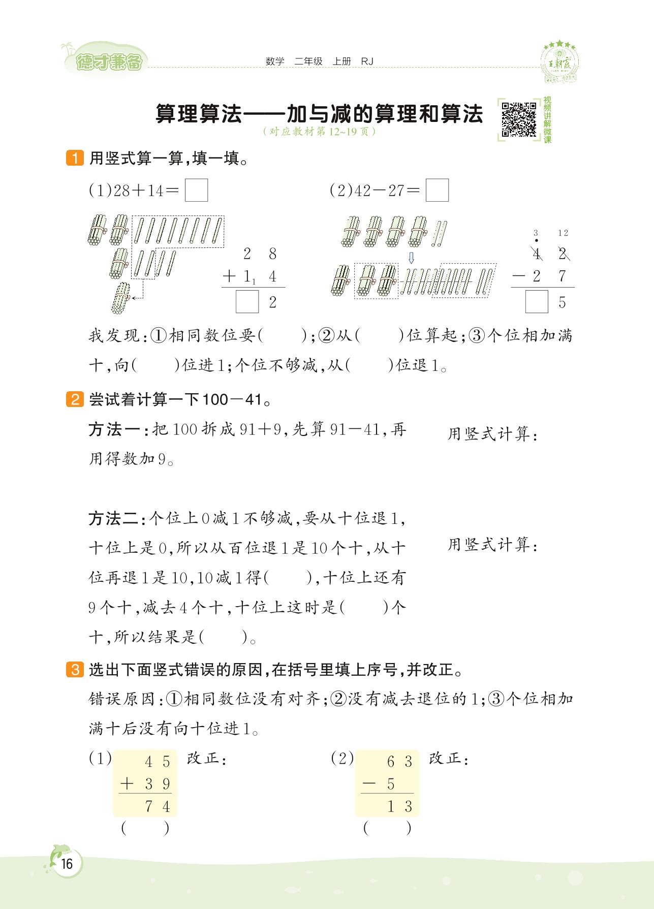 2022上册二年级数学人教版 第二单元 100以内的加法和减法(二)——算理算法 加与减的算理和算法