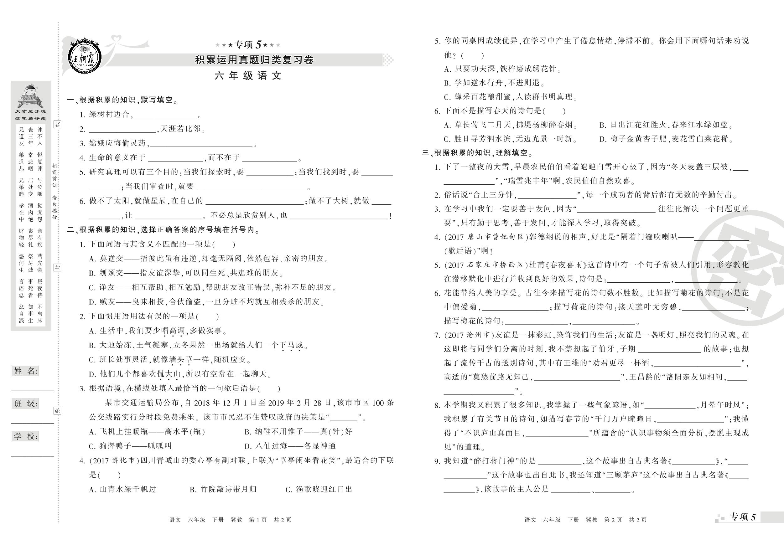 王朝霞期末专项卷——积累运用、课内阅读(一)真题归类复习卷六年级下册语文(冀教版)_R21080240144【0】