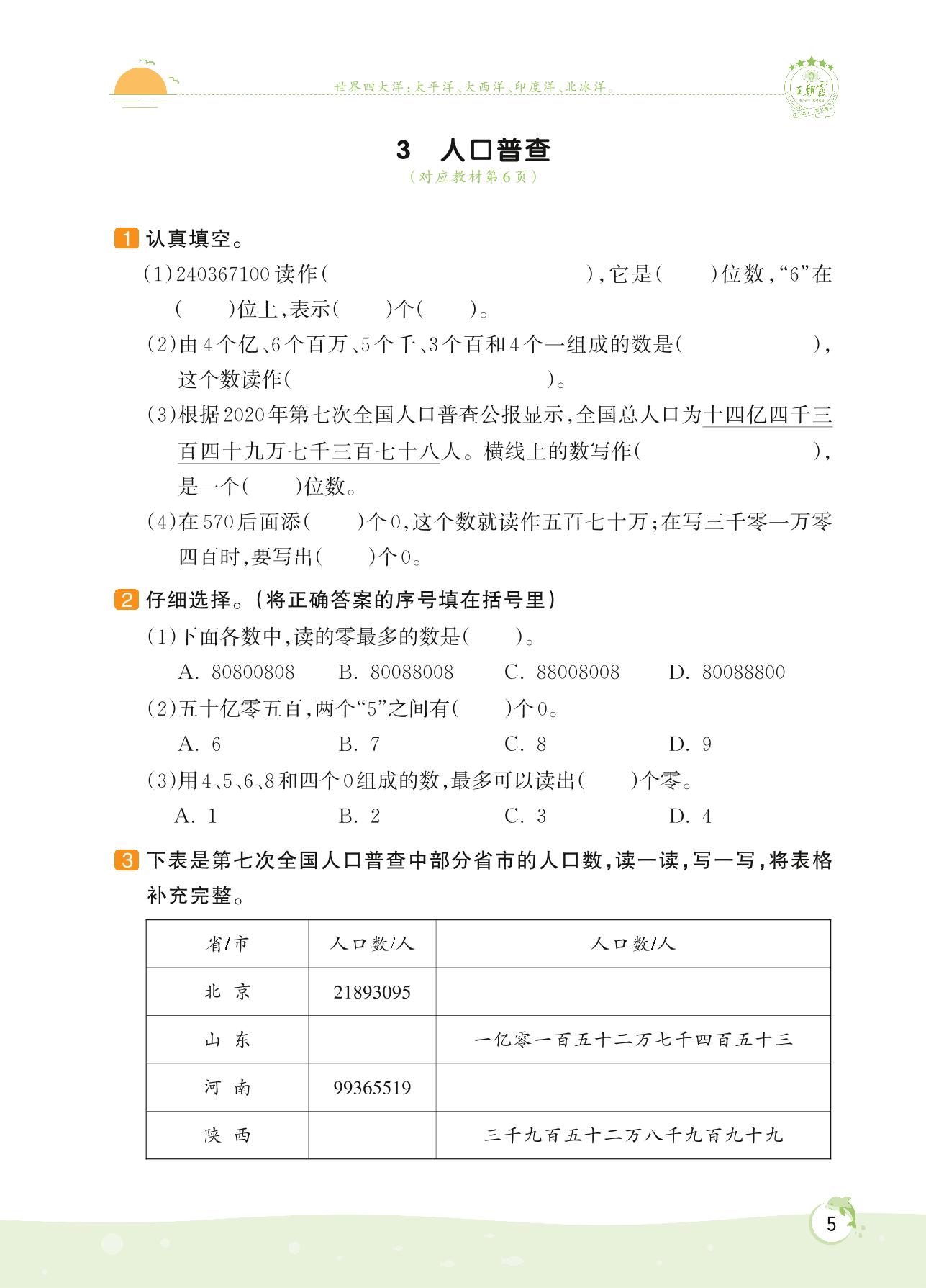 2022上册四年级数学北师版 第一单元 认识更大的数——3 人口普查