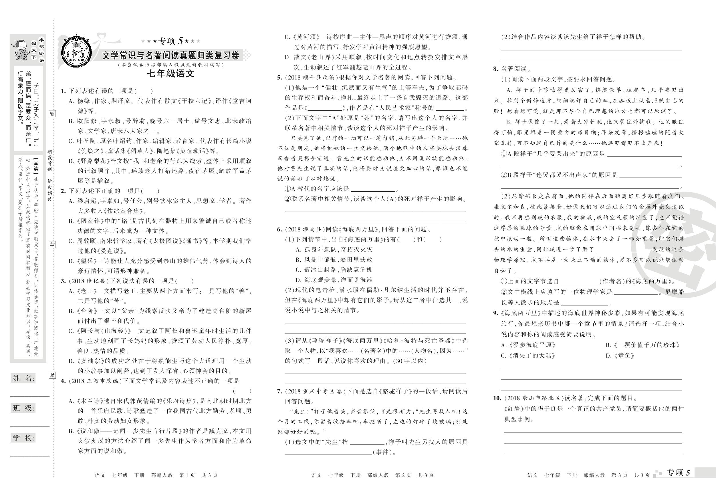 王朝霞期末专项卷——文学常识与名著阅读、口语交际与综合性学习真题归类复习卷七年级下册语文(人教版)_R21080240205【0】