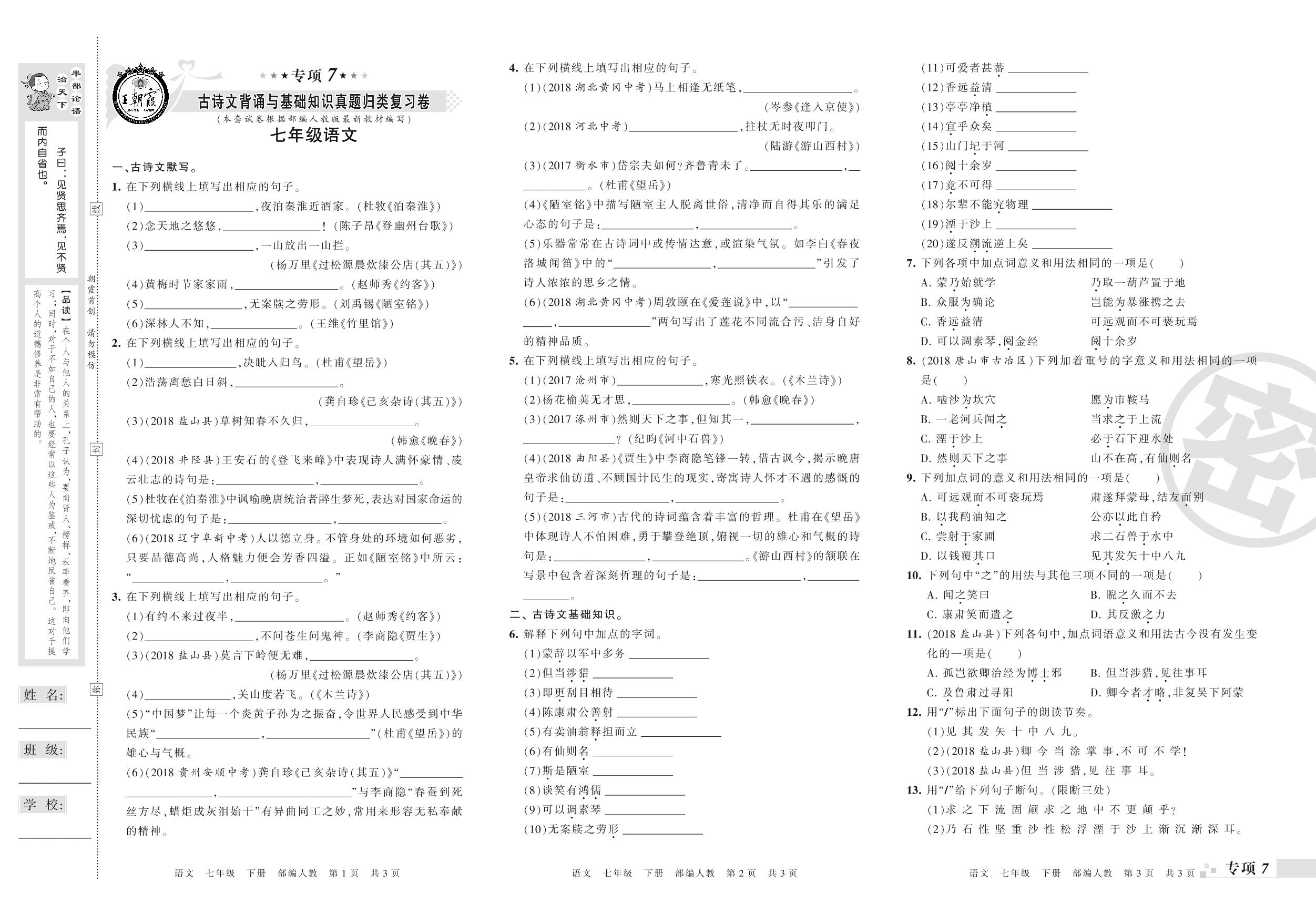 王朝霞期末专项卷——古诗文背诵与基础知识、古诗词阅读真题归类复习卷七年级下册语文(人教版)_R21080240214【0】