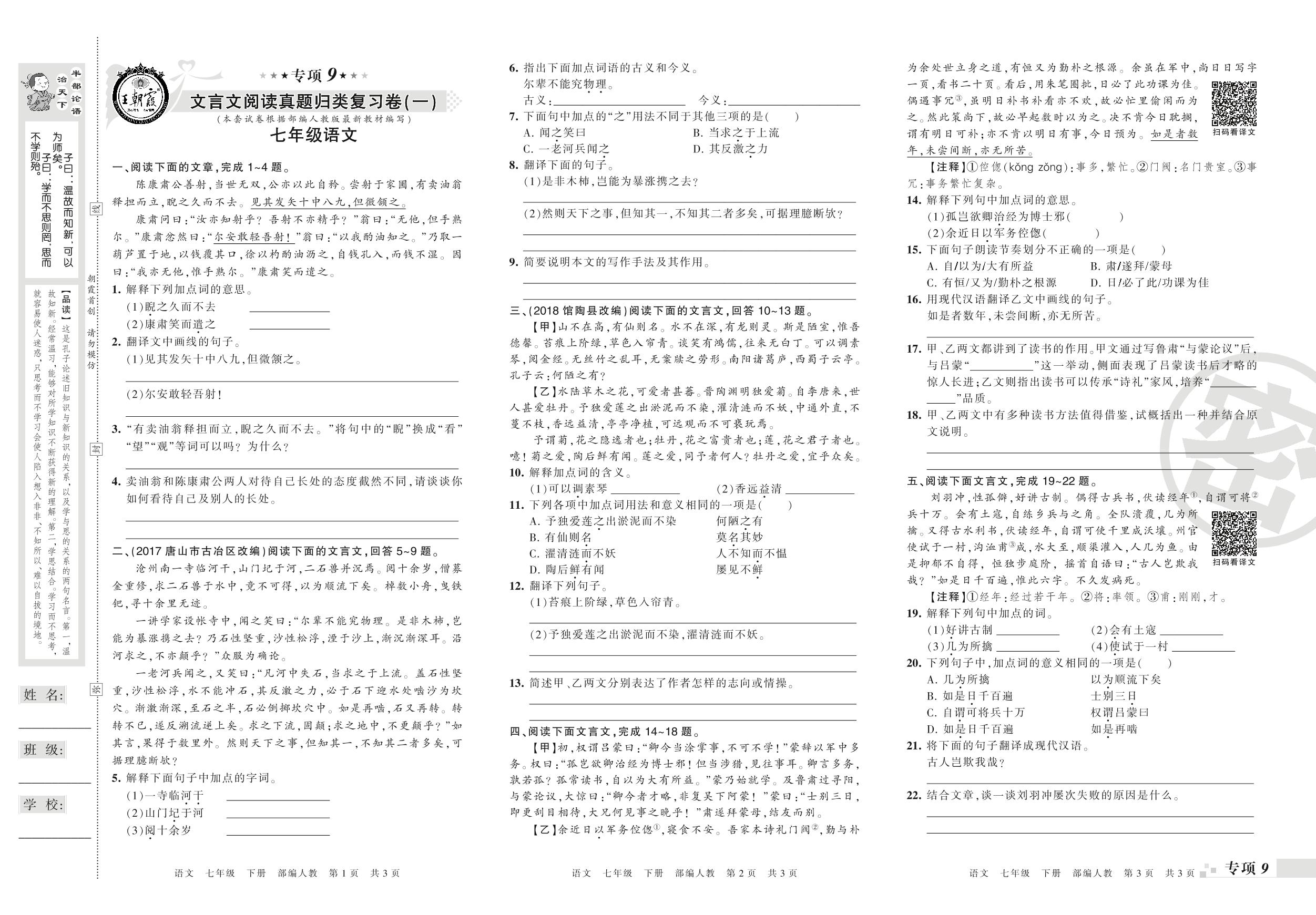 王朝霞期末专项卷——文言文阅读(一)(二)真题归类复习卷年级下册语文(人教版)_R21080240221【0】