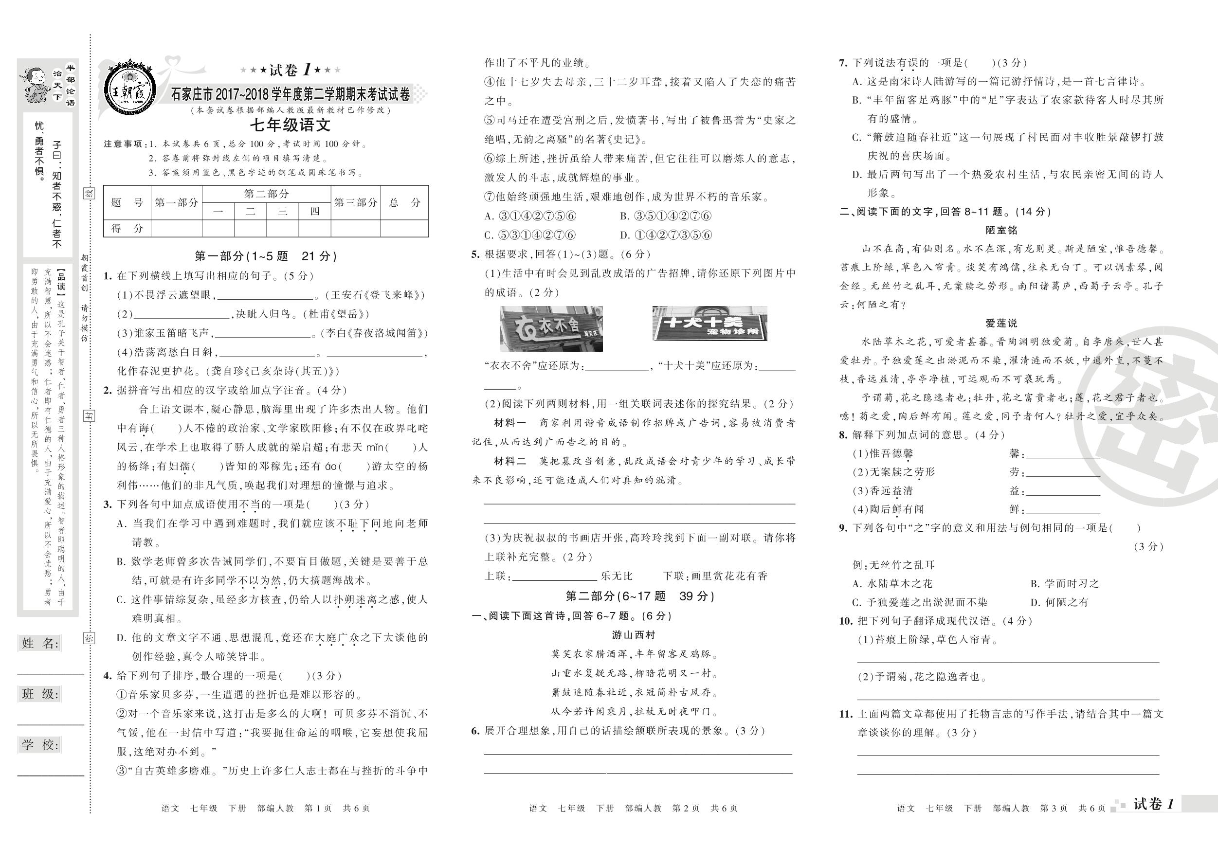 2017-2018学年第二学期石家庄市七年级语文试卷(人教版)【1】