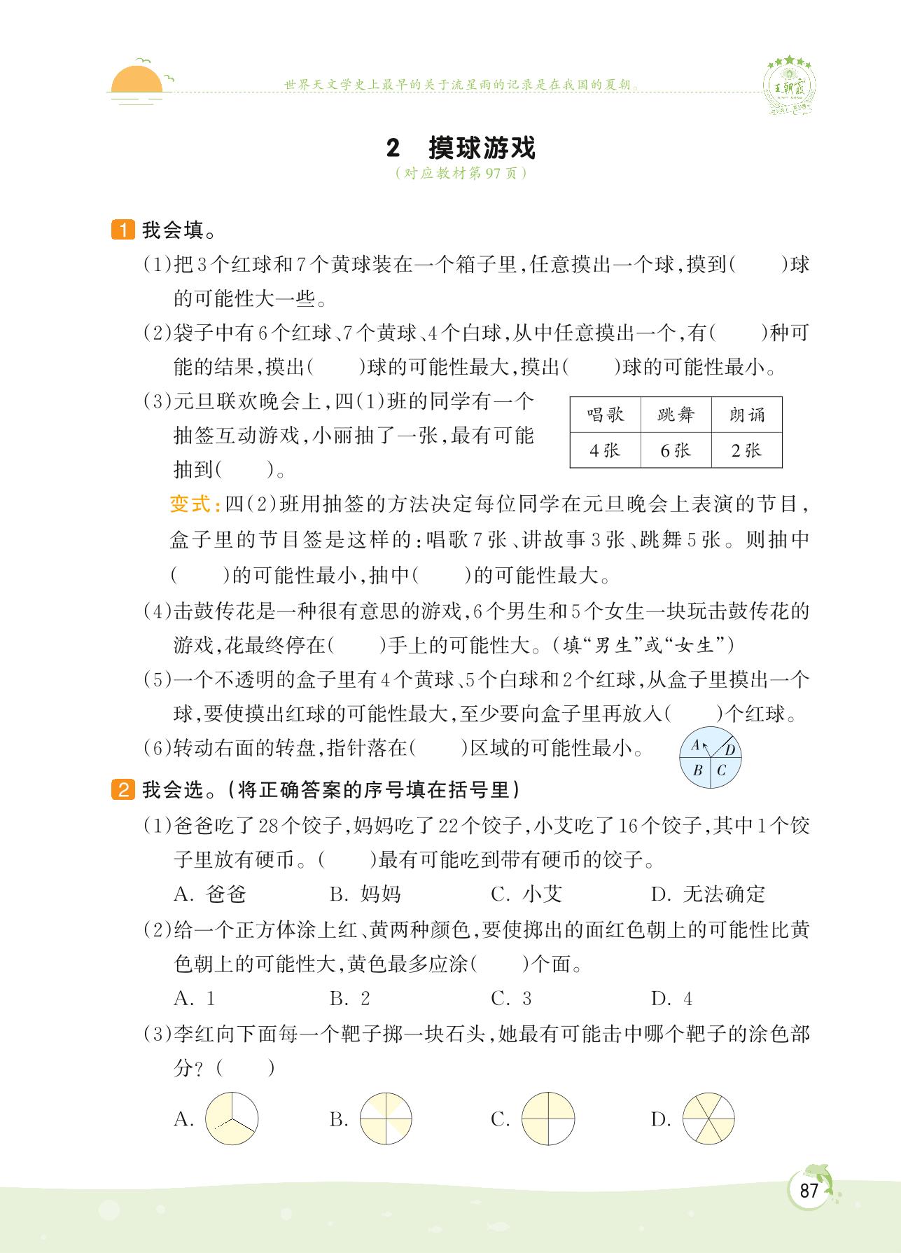 2022上册四年级数学北师版 第八单元 可能性——2 摸球游戏
