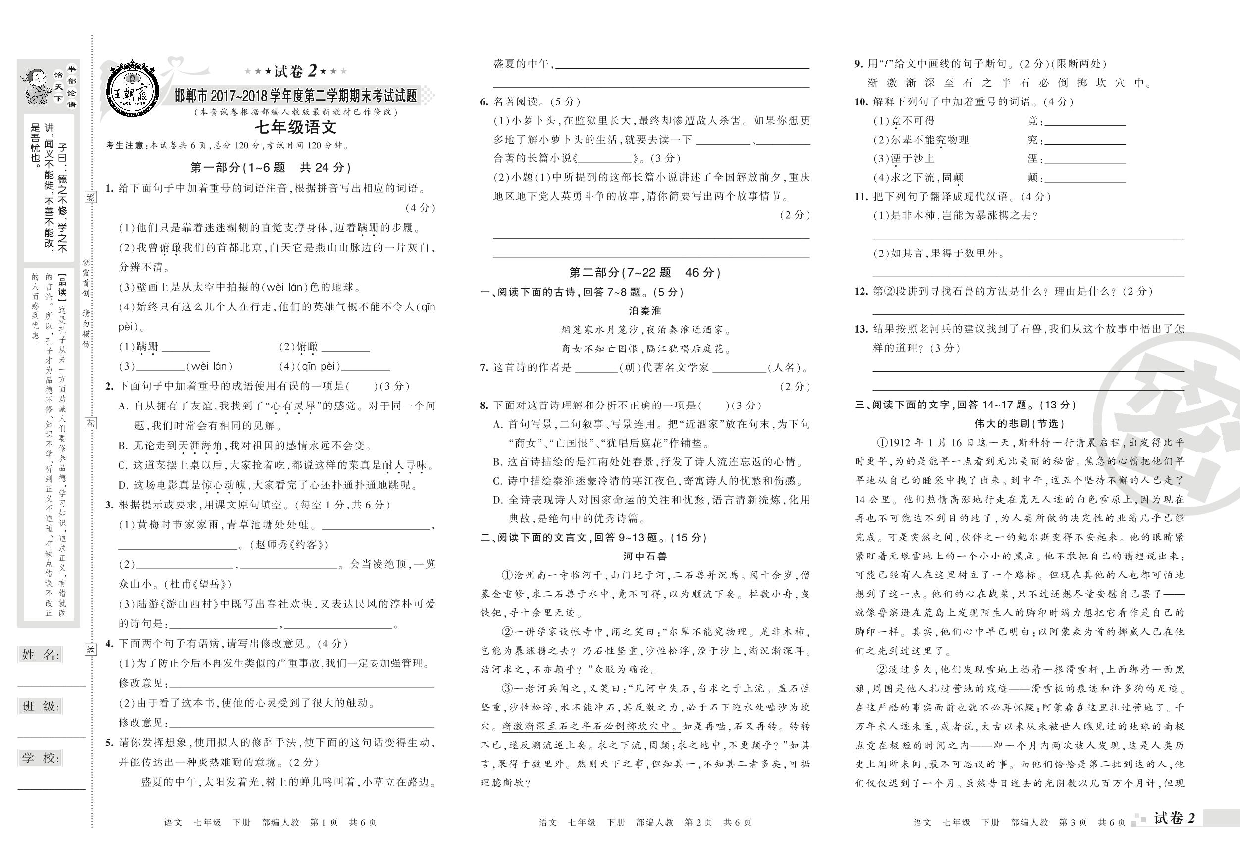 2017-2018学年第二学期邯郸市七年级语文试卷(人教版)【2】