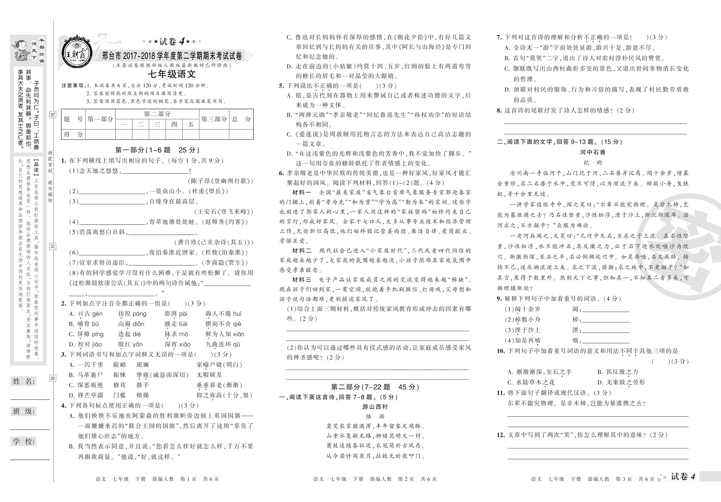 2017-2018学年第二学期邢台市七年级语文试卷(人教版)【4】
