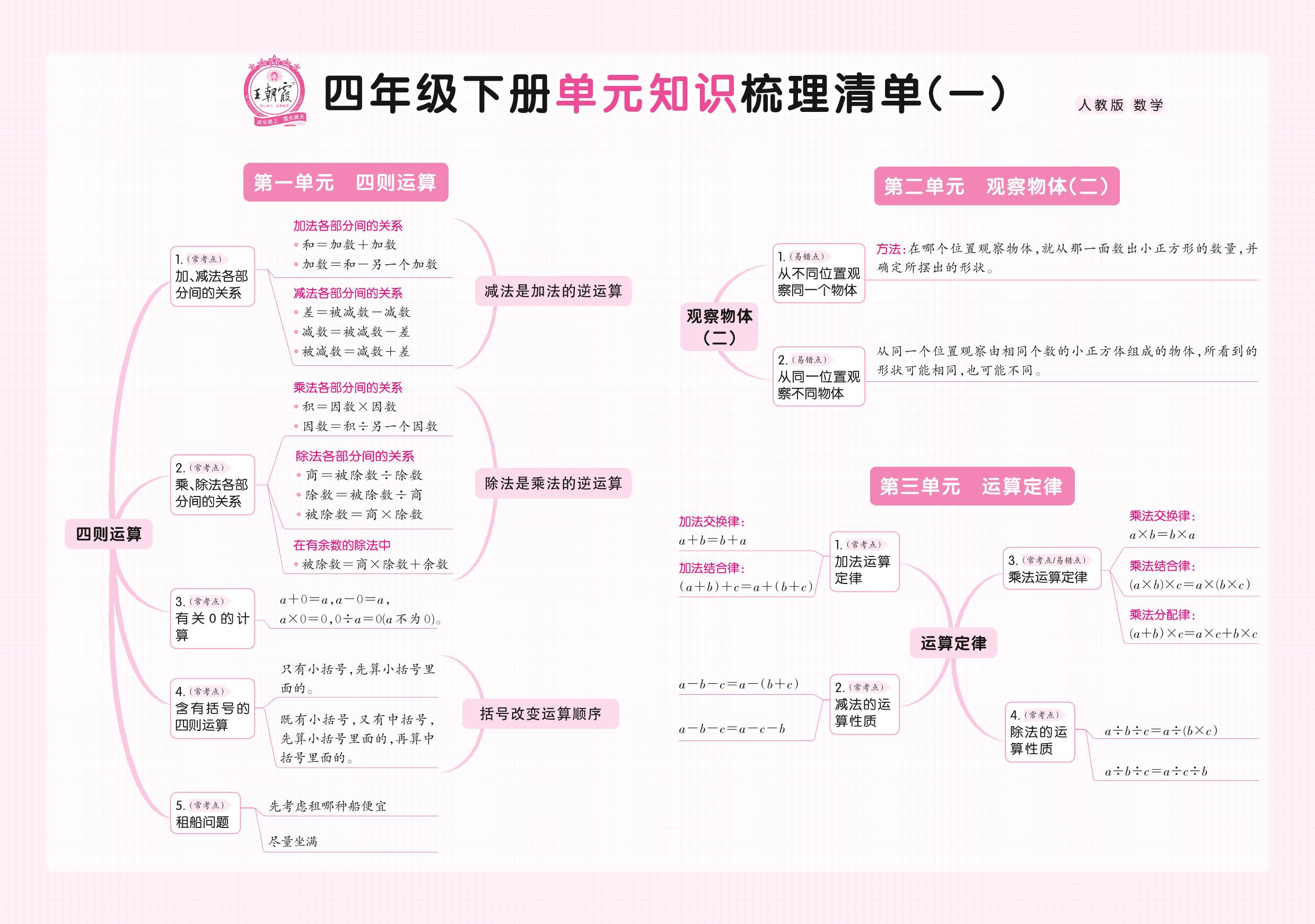 2022下册四年级数学人教版 单元知识梳理清单
