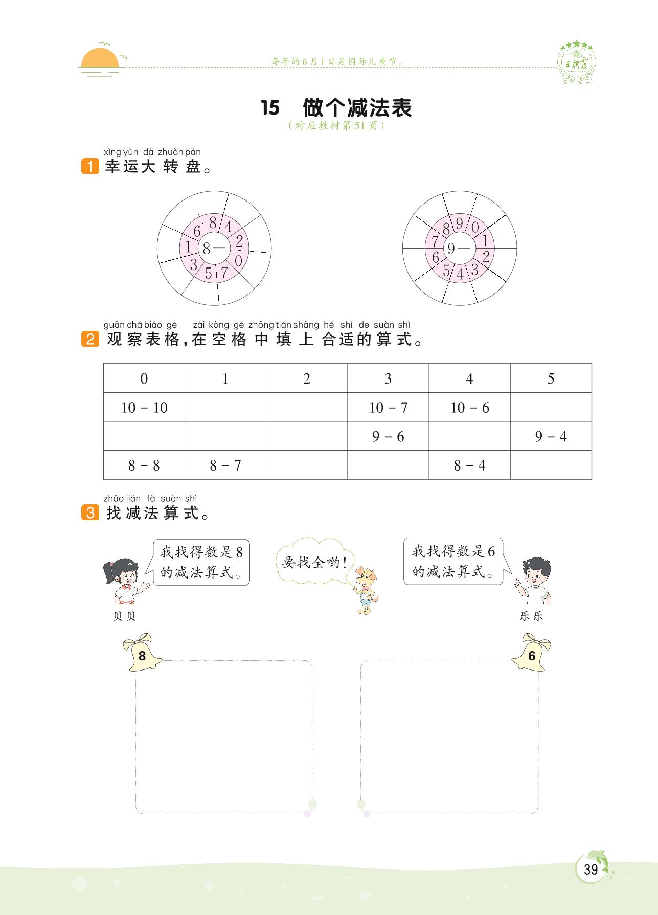 2022上册一年级数学北师版 第三单元 加与减(一)——15 做个减法表