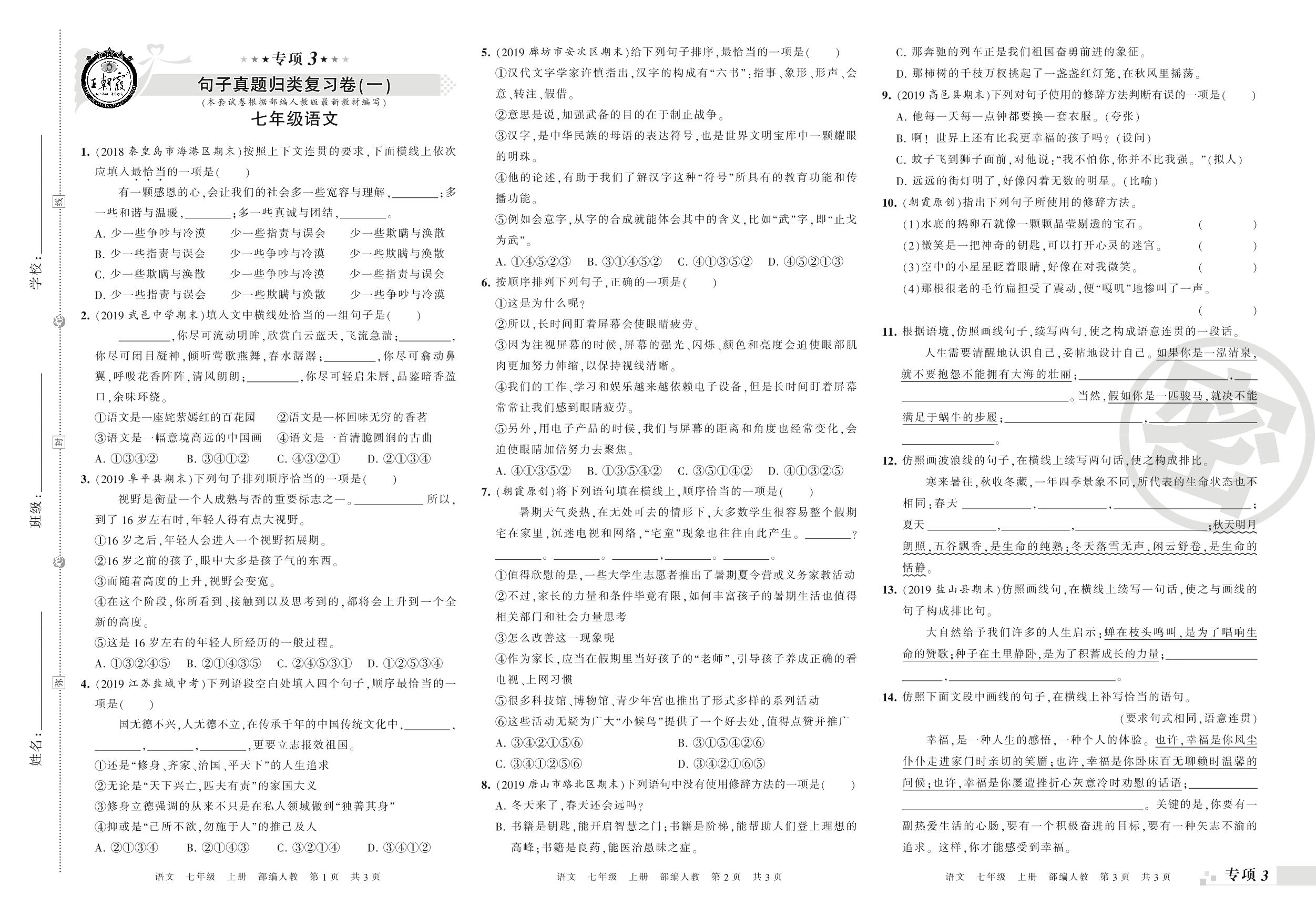 王朝霞期末专项卷——句子真题归类复习七年级上册语文(人教版)_R21080240411【0】