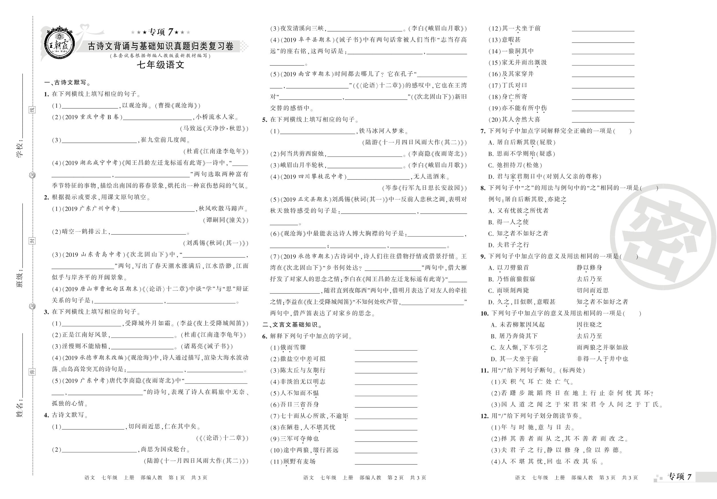 王朝霞期末专项卷——古诗文背诵与基础知识、古诗词阅读真题归类复习七年级上册语文(人教版)_R21080240428【0】