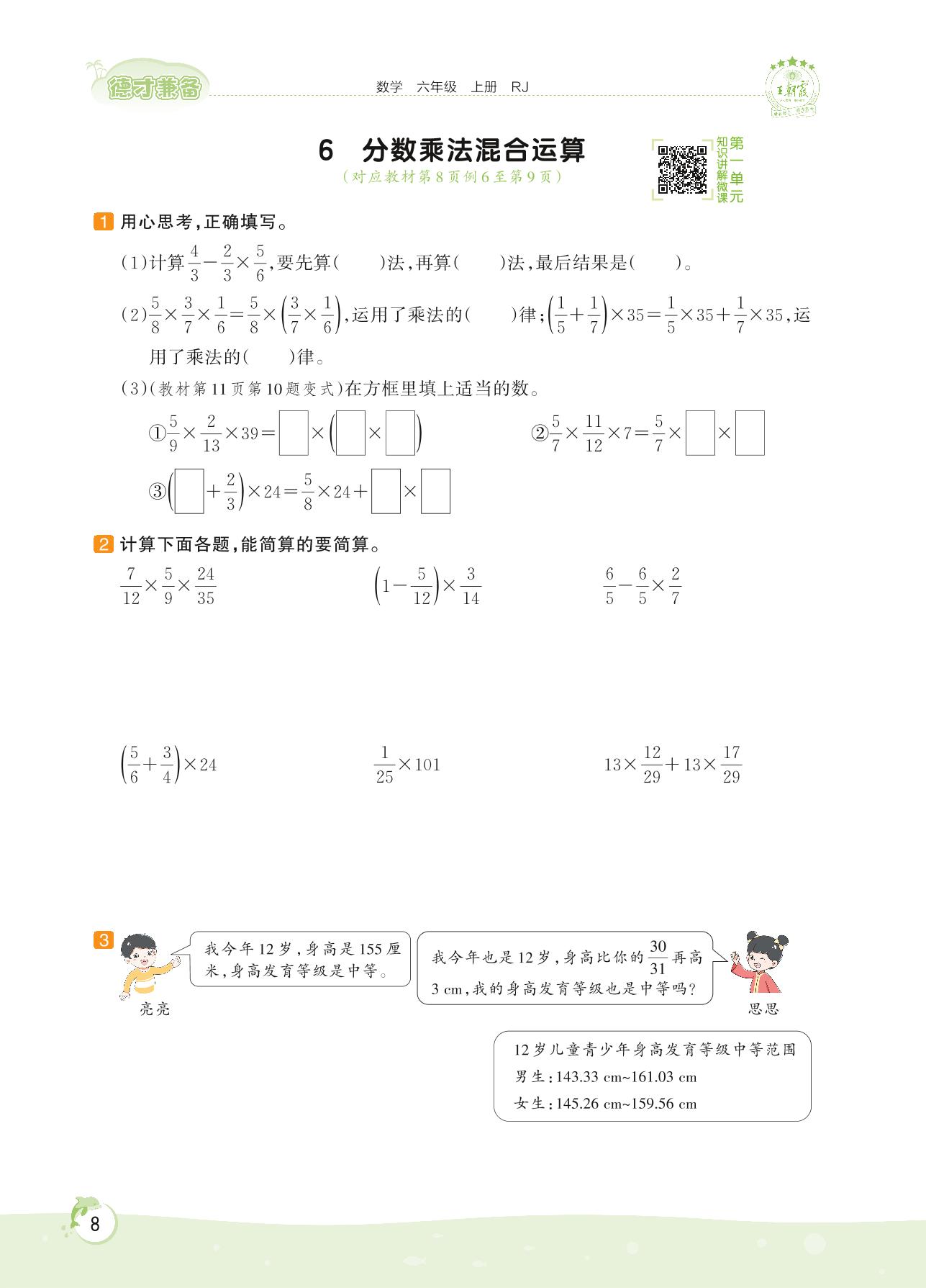 2022上册六年级数学人教版 第一单元 分数乘法——6 分数乘法混合运算