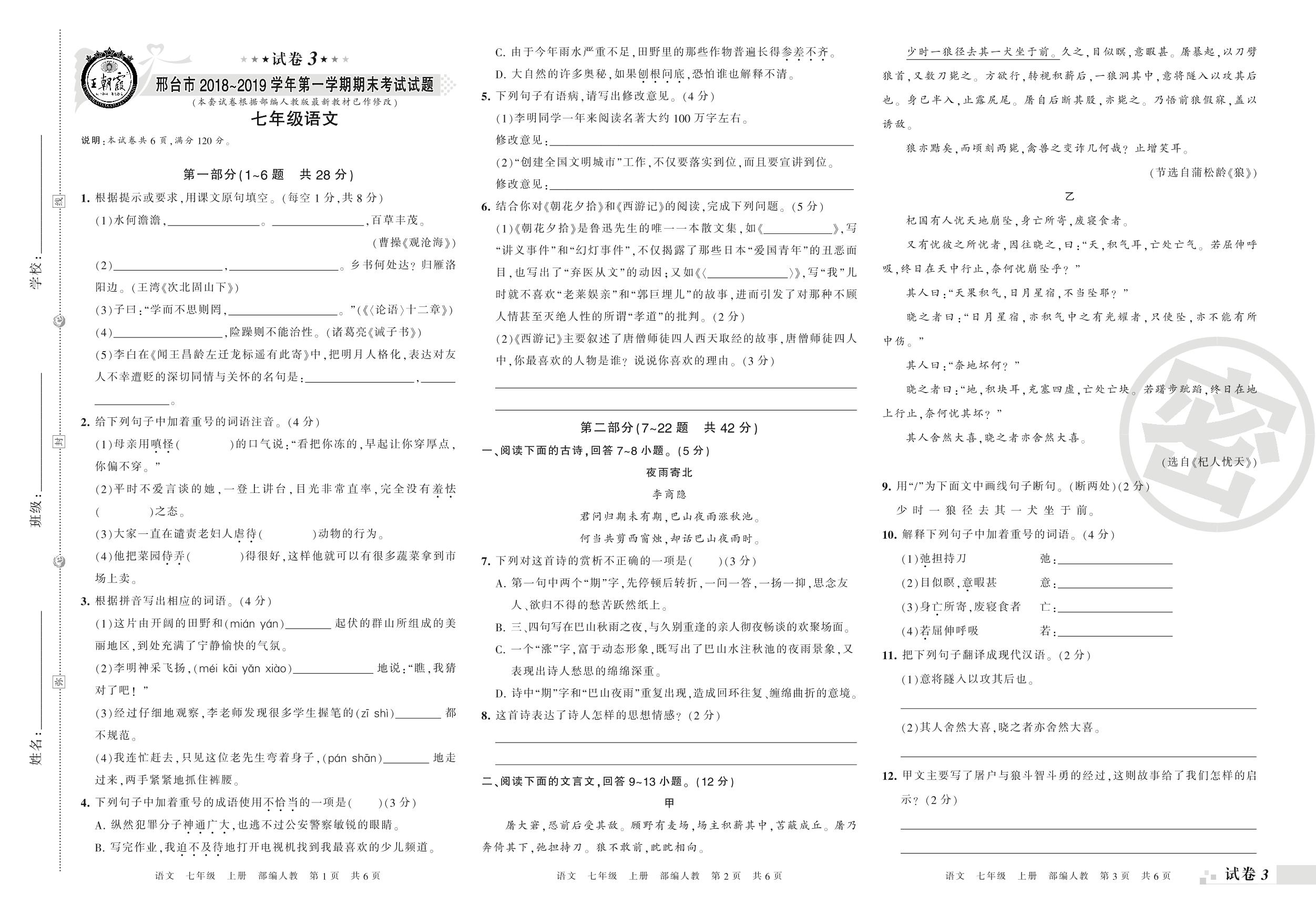2018-2019学年第一学期邢台市七年级语文试卷(人教版)【3】
