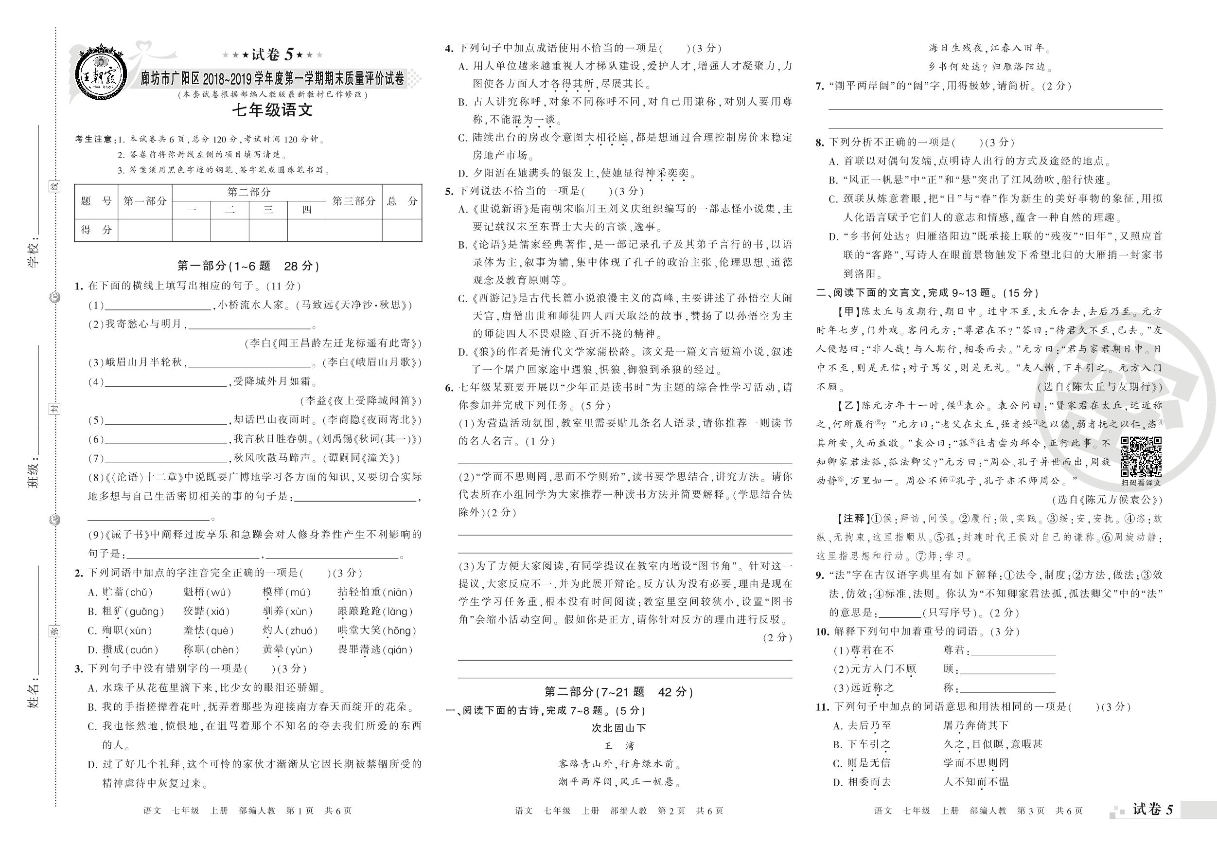 2018-2019学年第一学期廊坊市广阳区七年级语文试卷(人教版)【5】