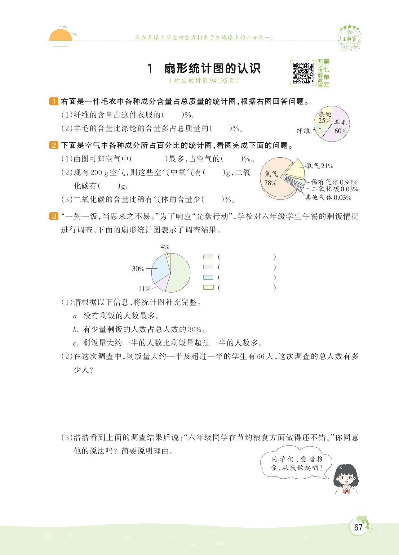 2022上册六年级数学人教版 第七单元 扇形统计图——1 扇形统计图的认识