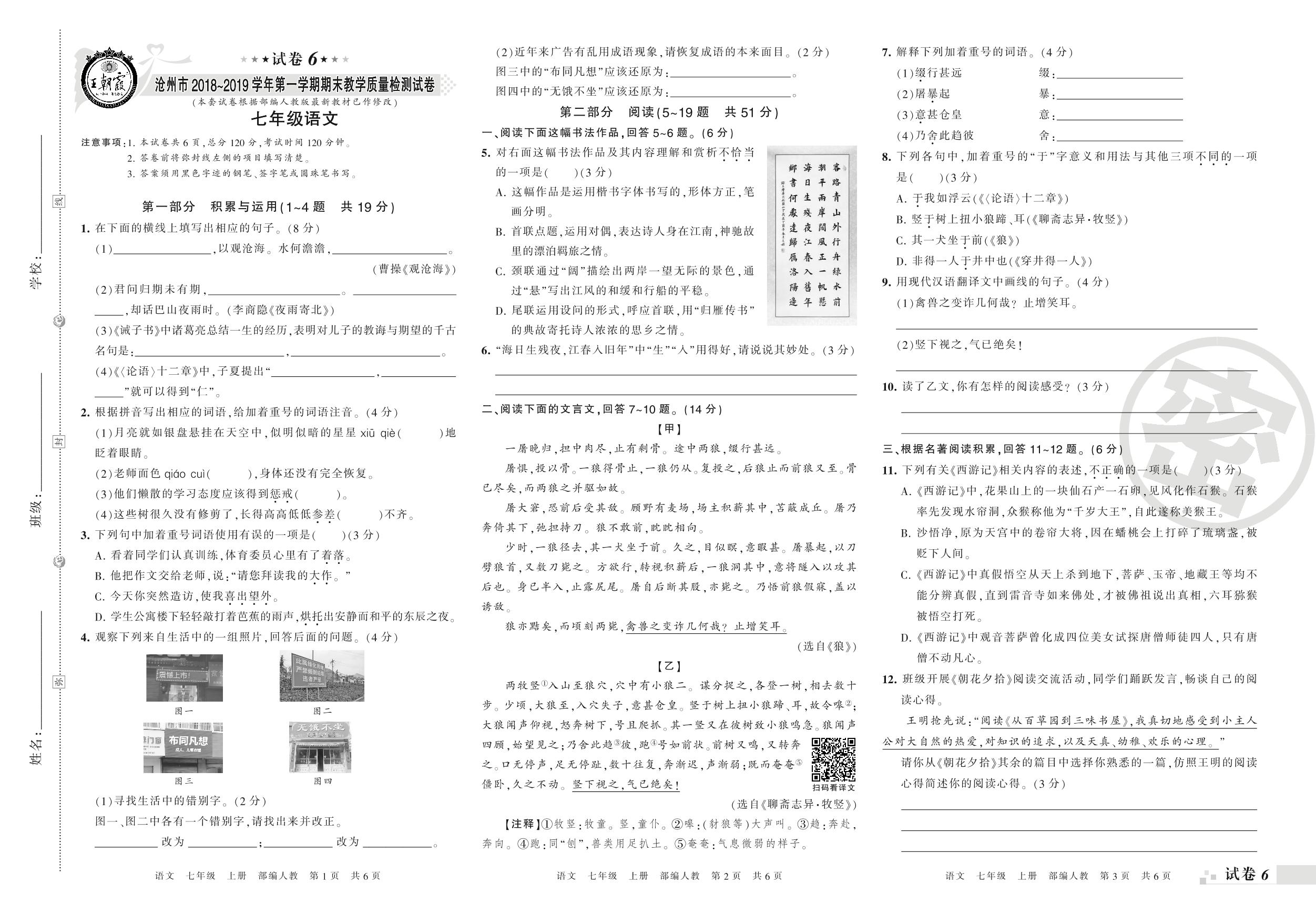 2018-2019学年第一学期沧州市七年级语文试卷(人教版)【6】