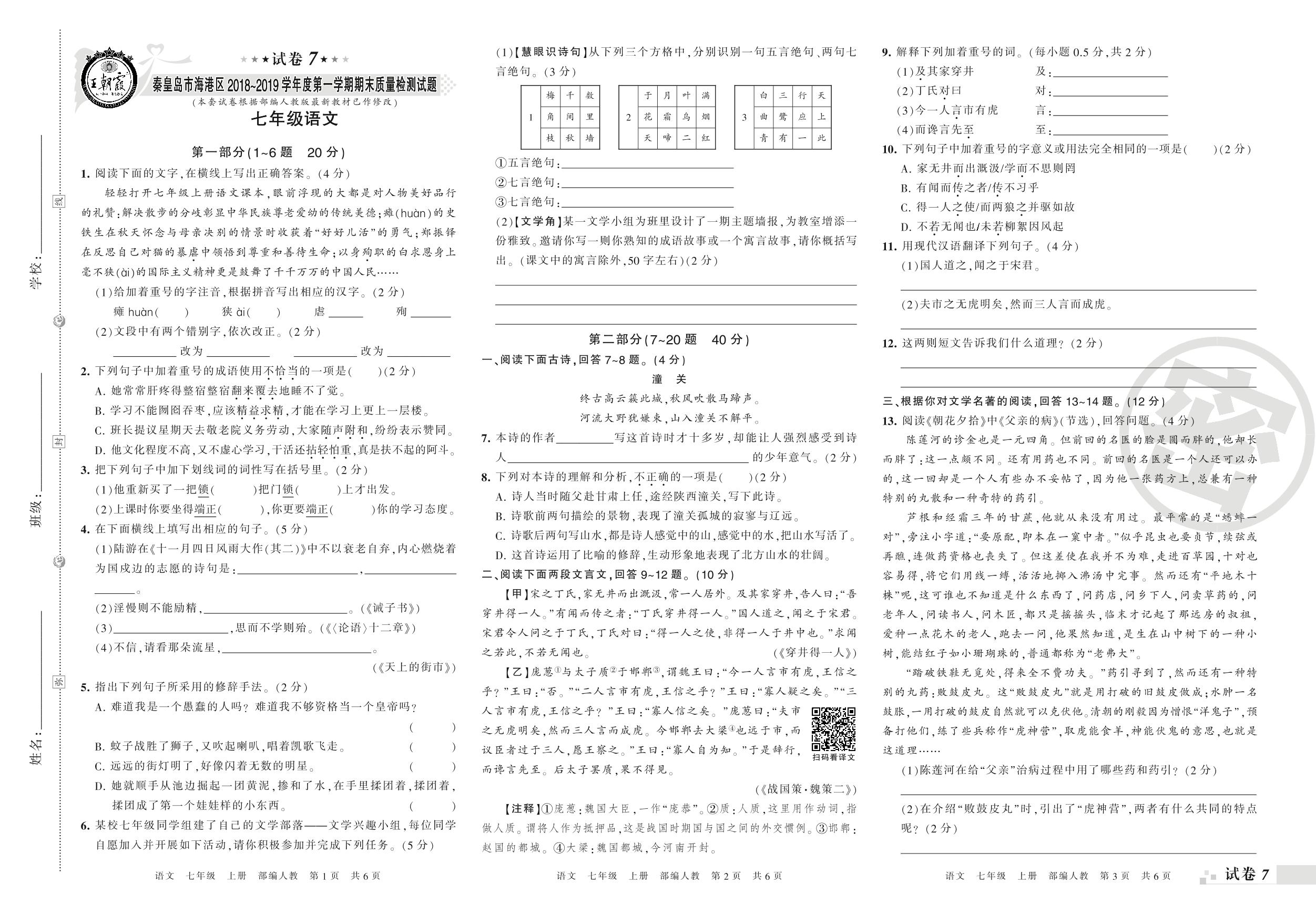 2018-2019学年第一学期秦皇岛市海港区七年级语文试卷(人教版)【7】