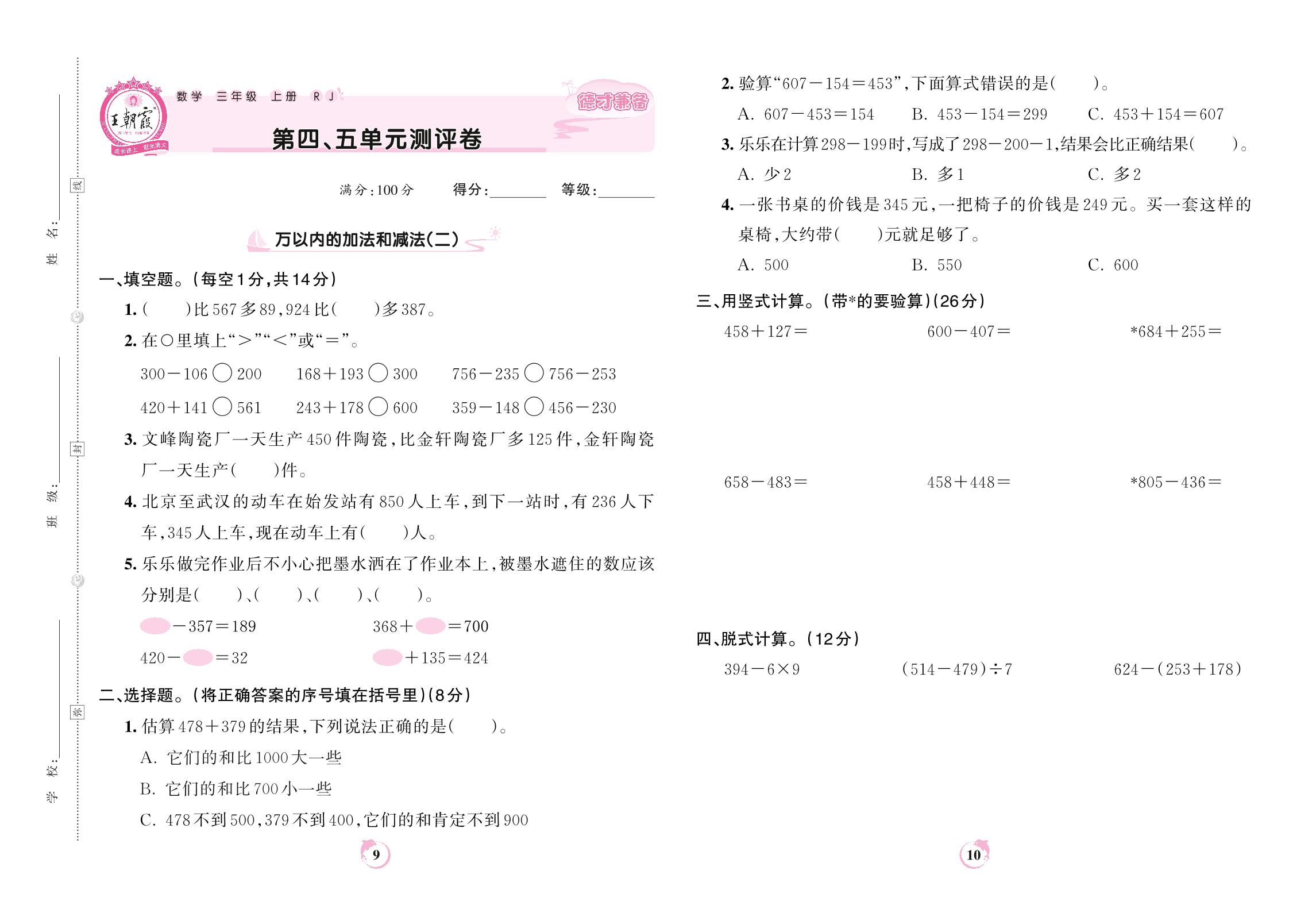 2022上册三年级数学人教版 第四、五单元测评卷