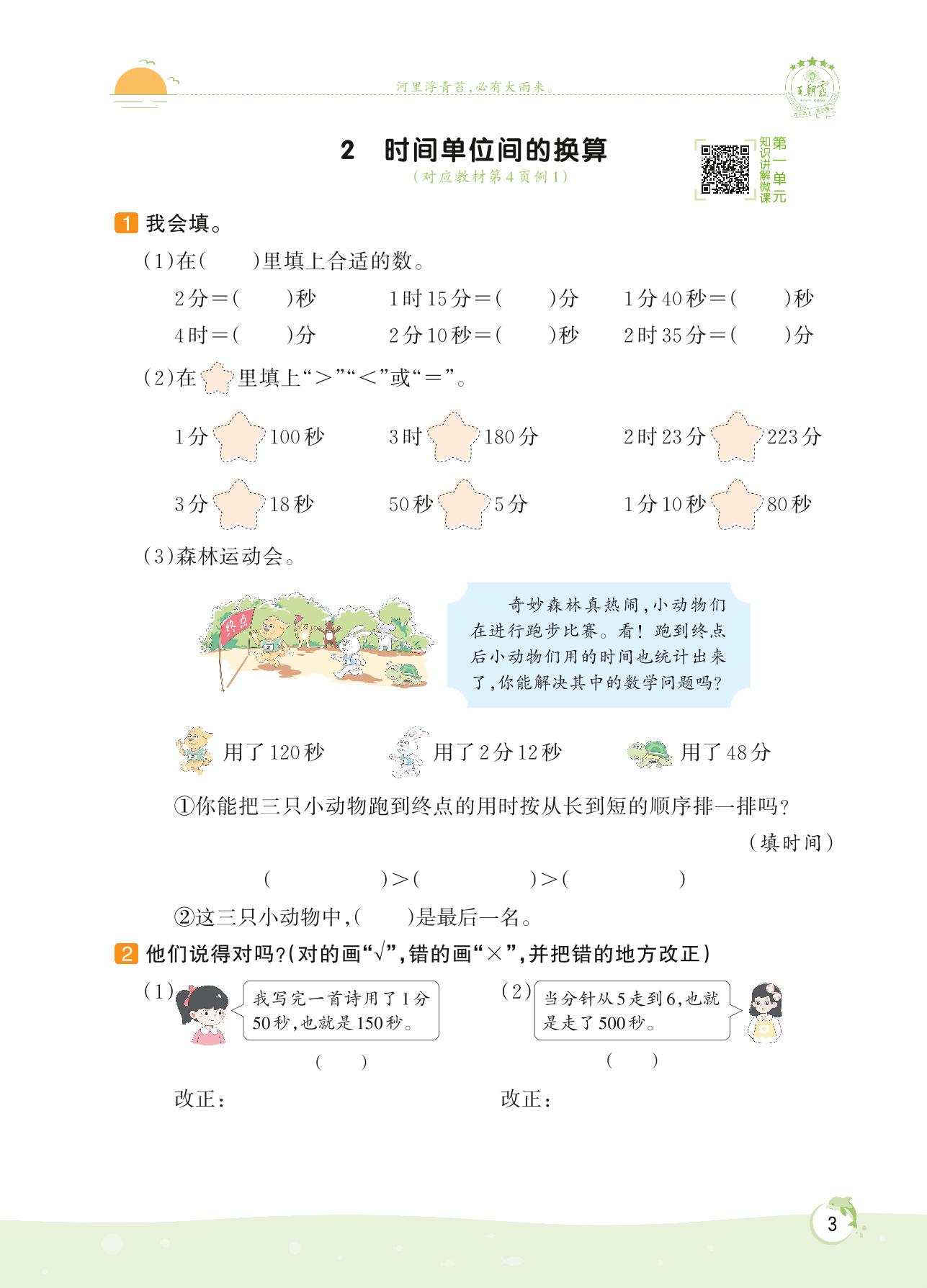 2022上册三年级数学人教版 第一单元 时、分、秒——2 时间单位间的换算