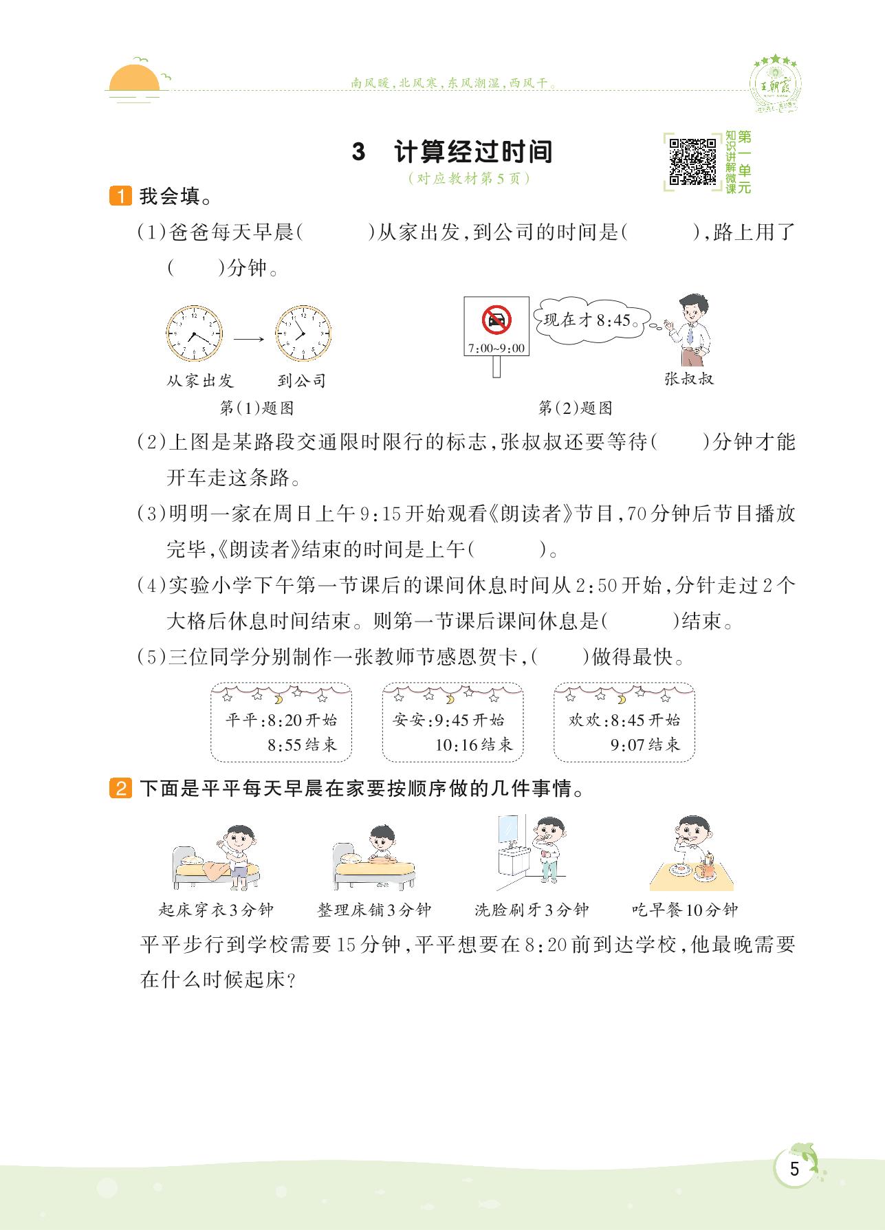 2022上册三年级数学人教版 第一单元 时、分、秒——3 计算经过时间