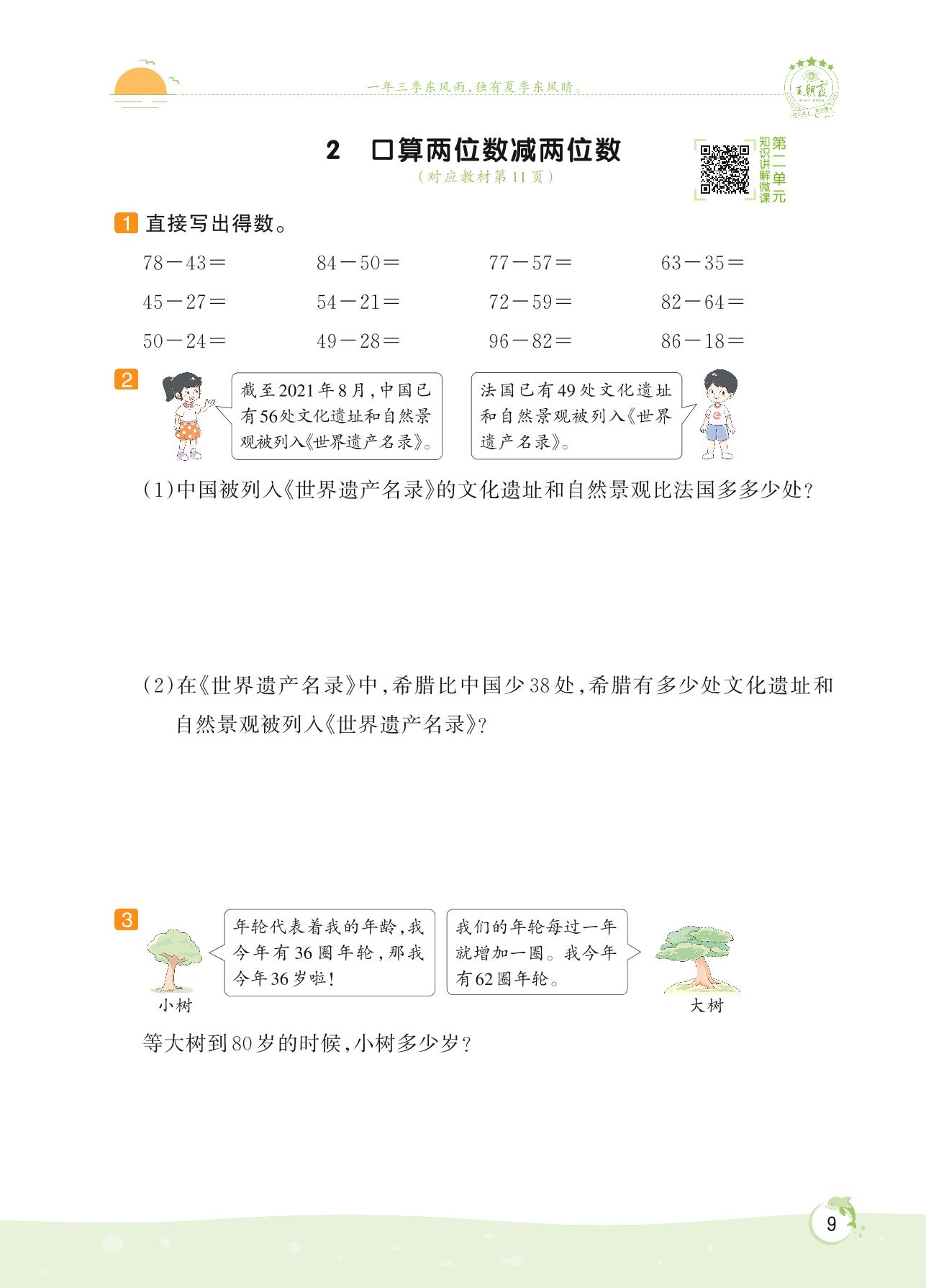 2022上册三年级数学人教版 第二单元 万以内的加法和减法(一)——2 口算两位数减两位数