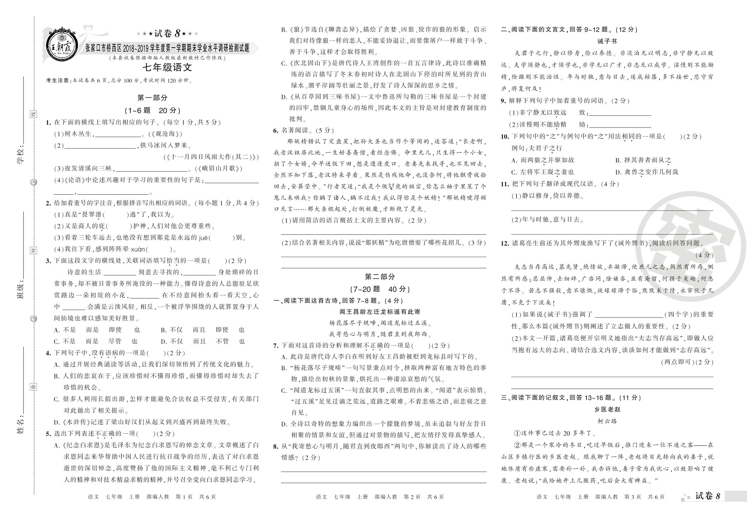 2018-2019学年第一学期张家口市桥西区七年级语文试卷(人教版)【8】