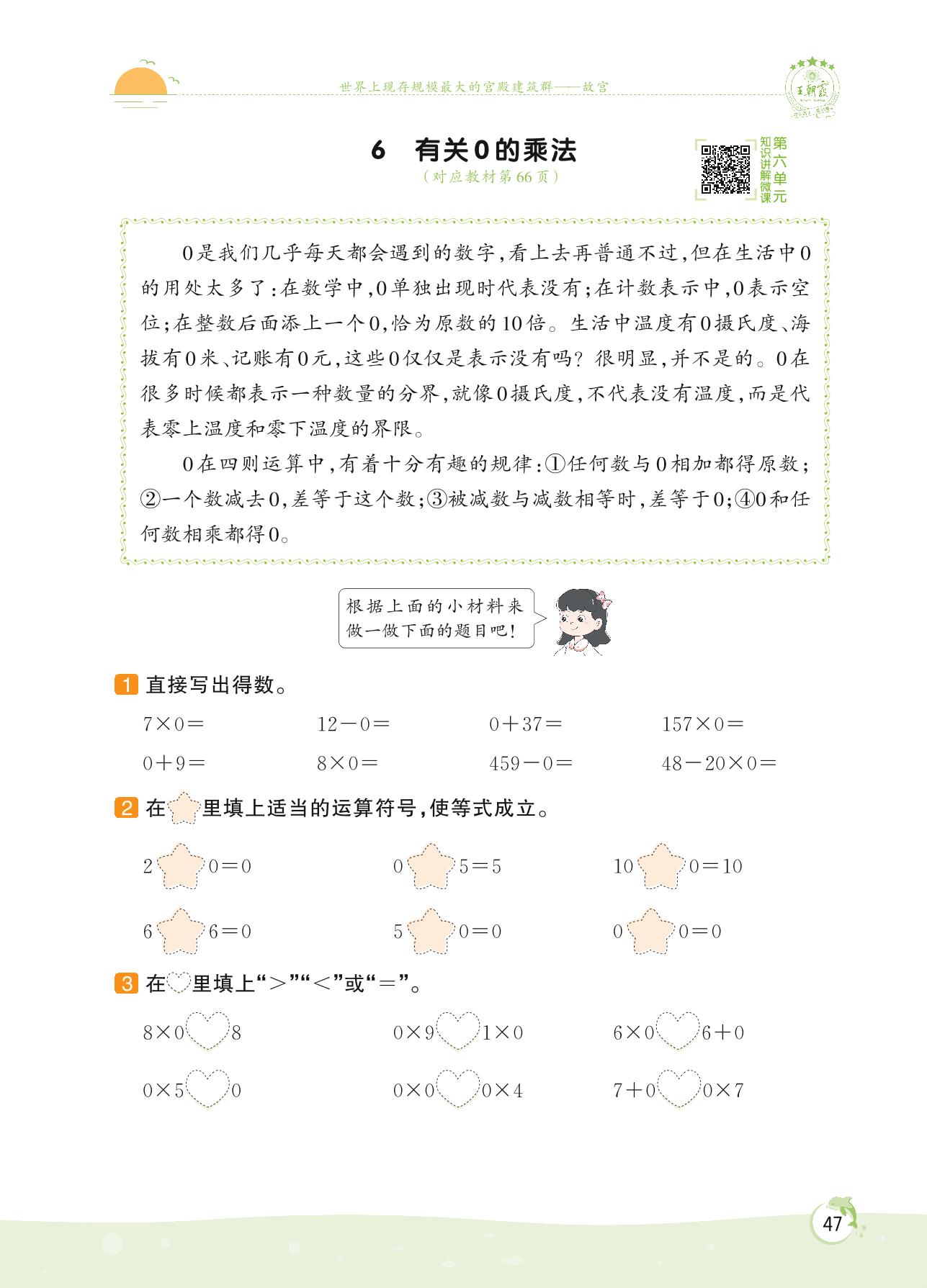 2022上册三年级数学人教版 第六单元 多位数乘一位数——6 有关0的乘法