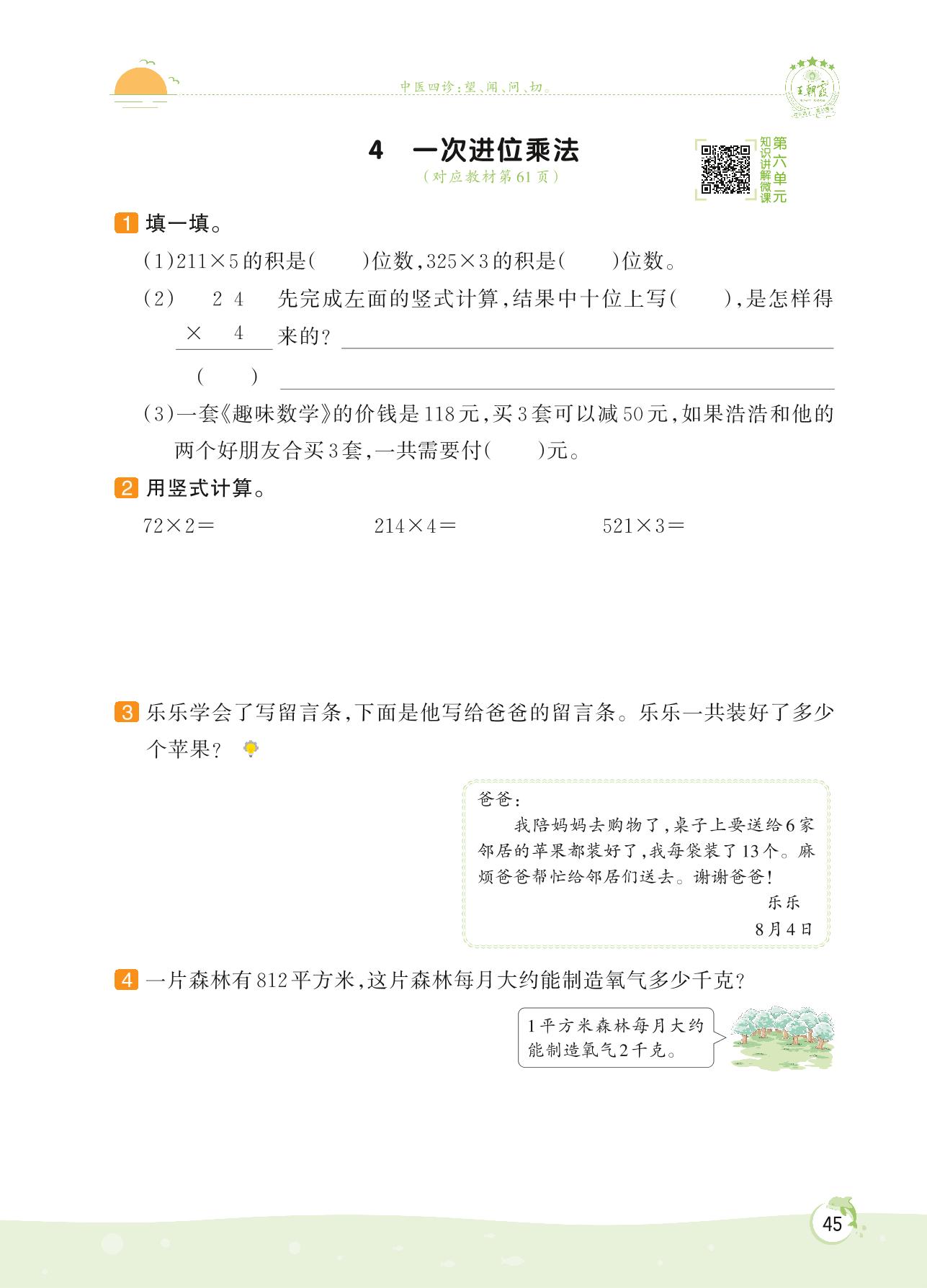 2022上册三年级数学人教版 第六单元 多位数乘一位数——4 一次进位乘法
