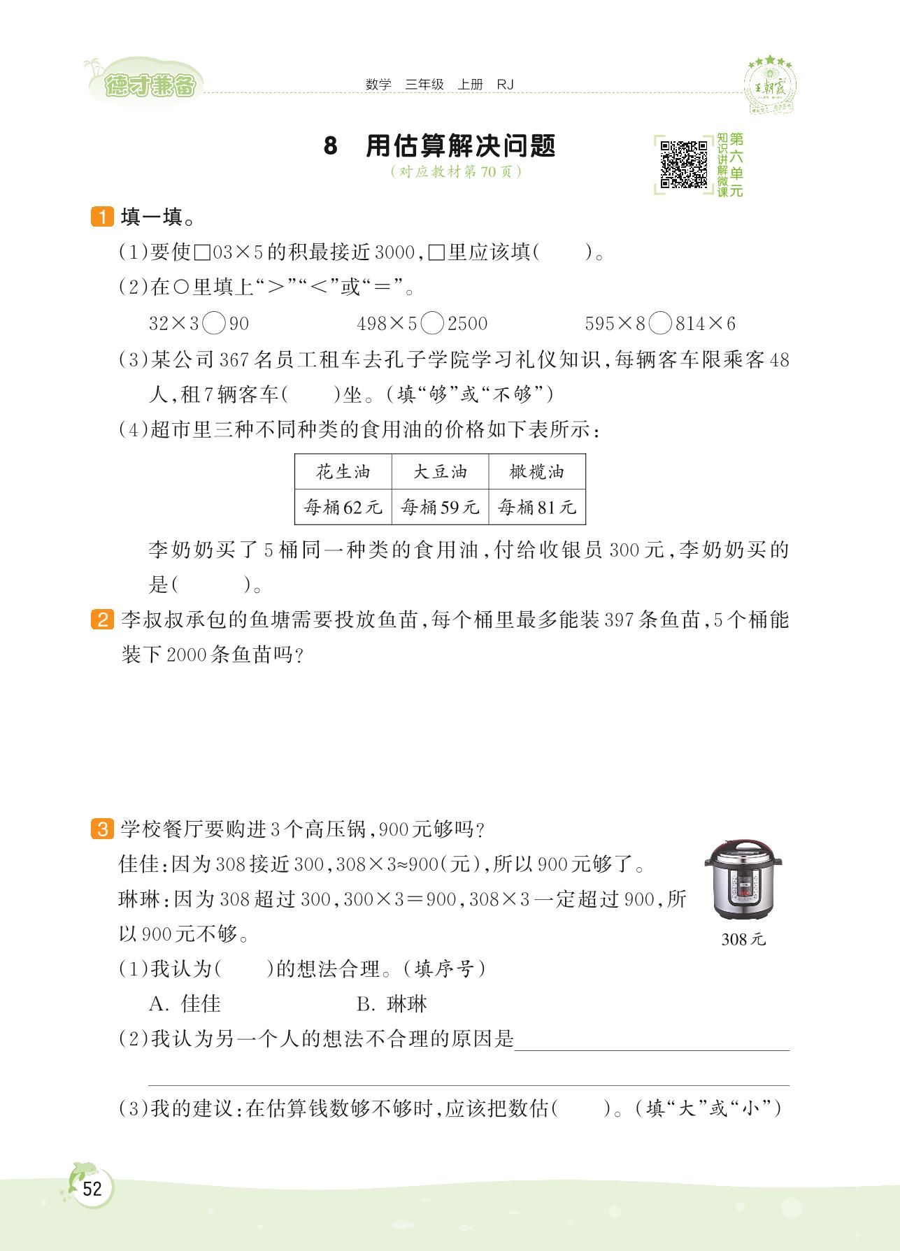 2022上册三年级数学人教版 第六单元 多位数乘一位数——8 用估算解决问题