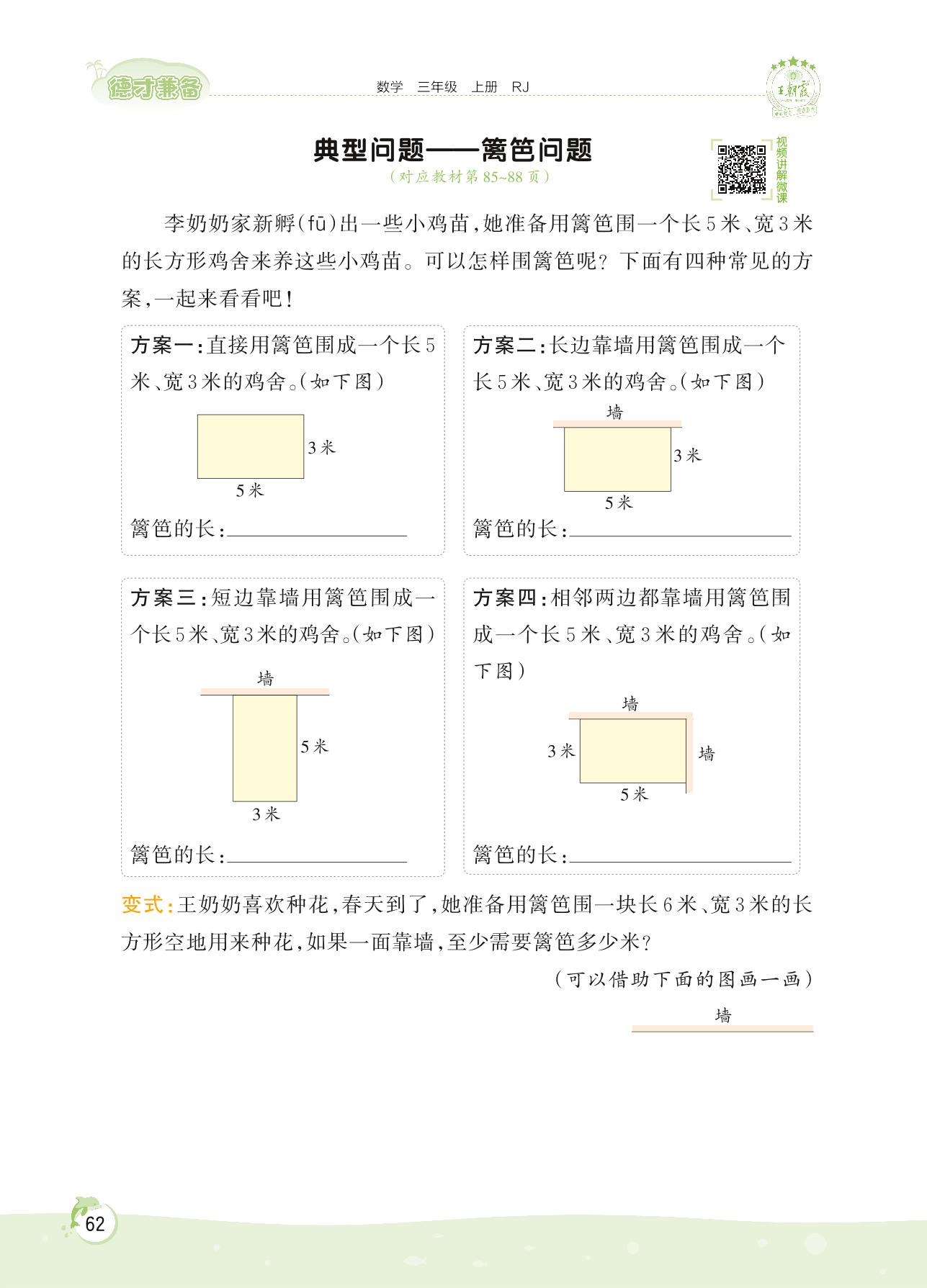 2022上册三年级数学人教版 第七单元 长方形和正方形——典型问题 篱笆问题