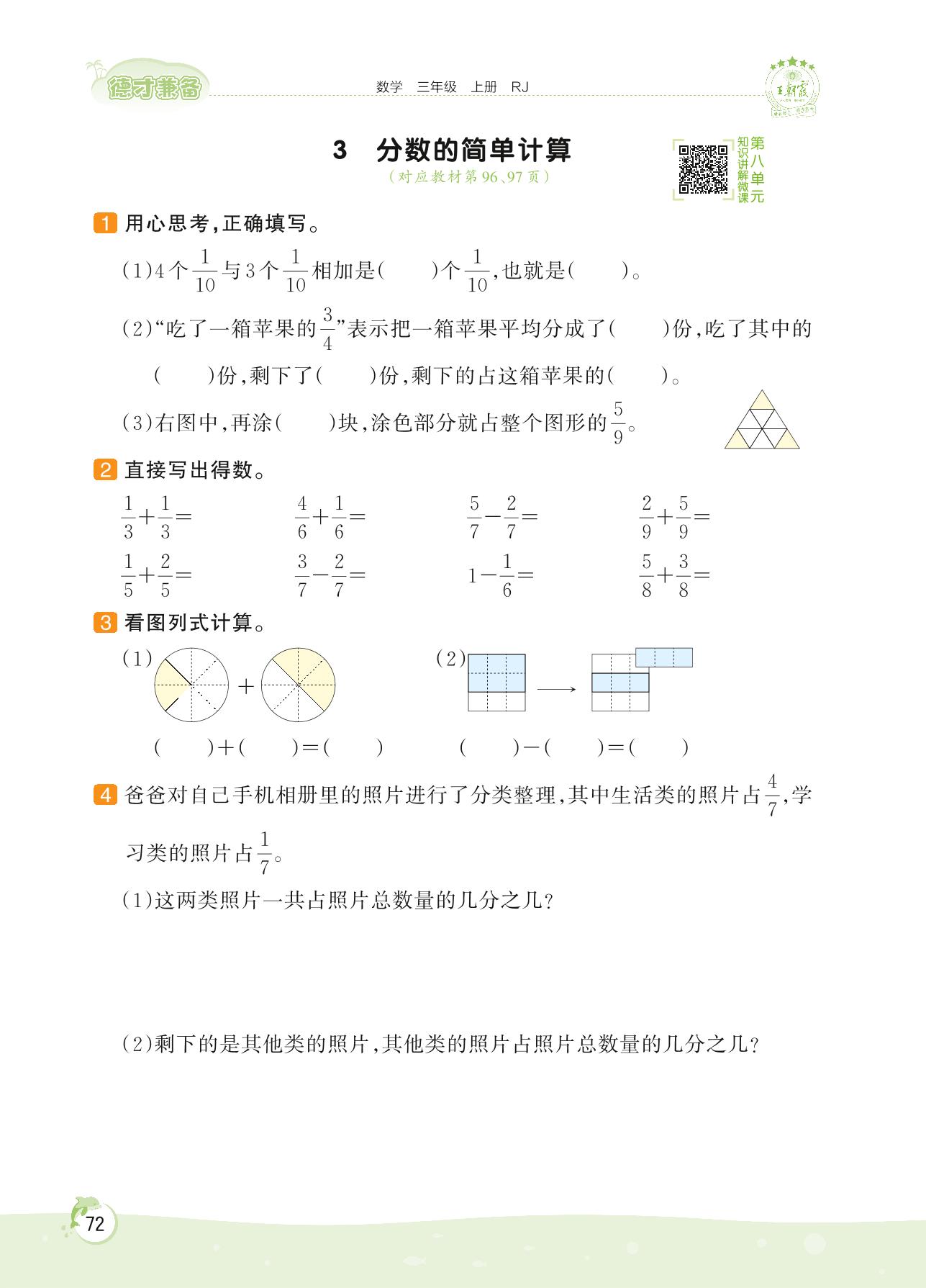 2022上册三年级数学人教版 第八单元 分数的初步认识——3 分数的简单计算