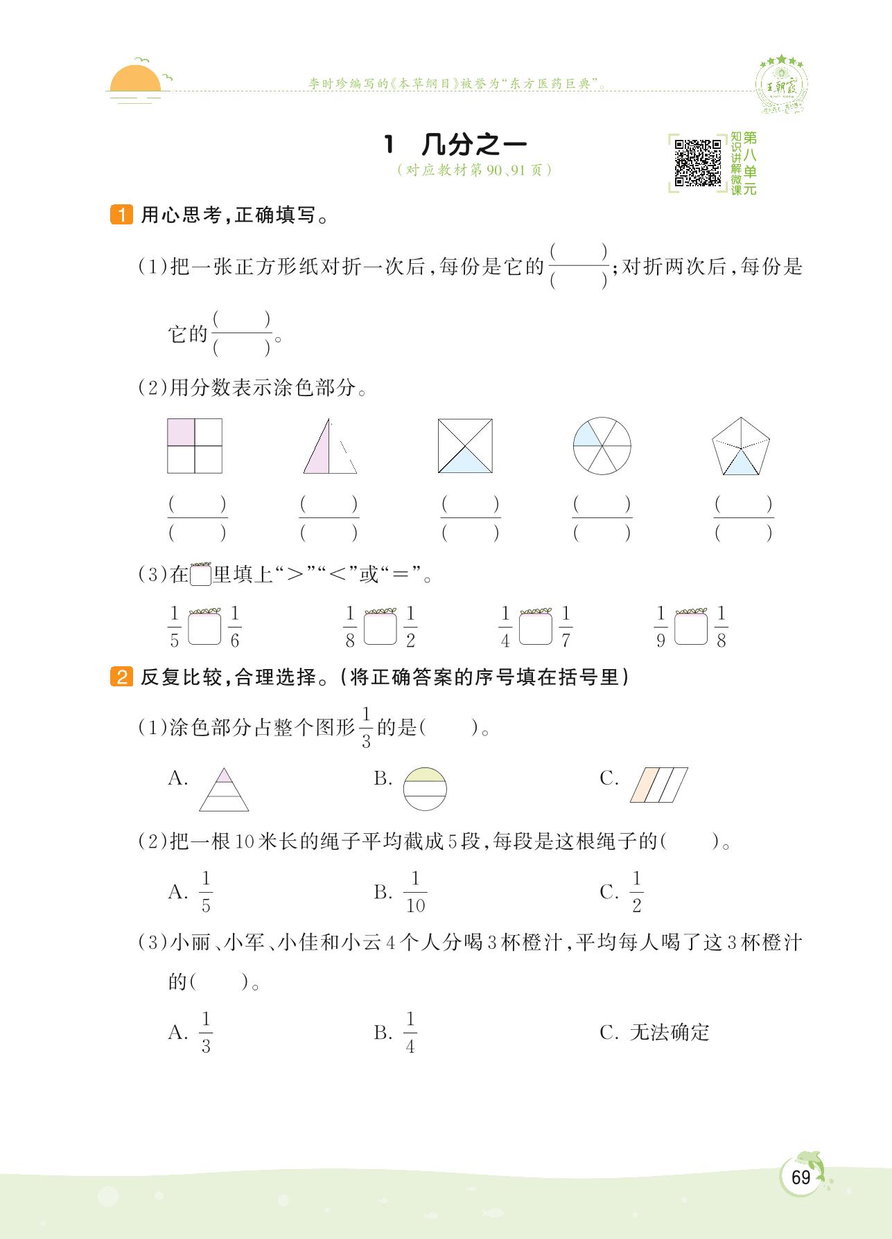 2022上册三年级数学人教版 第八单元 分数的初步认识——1 几分之一