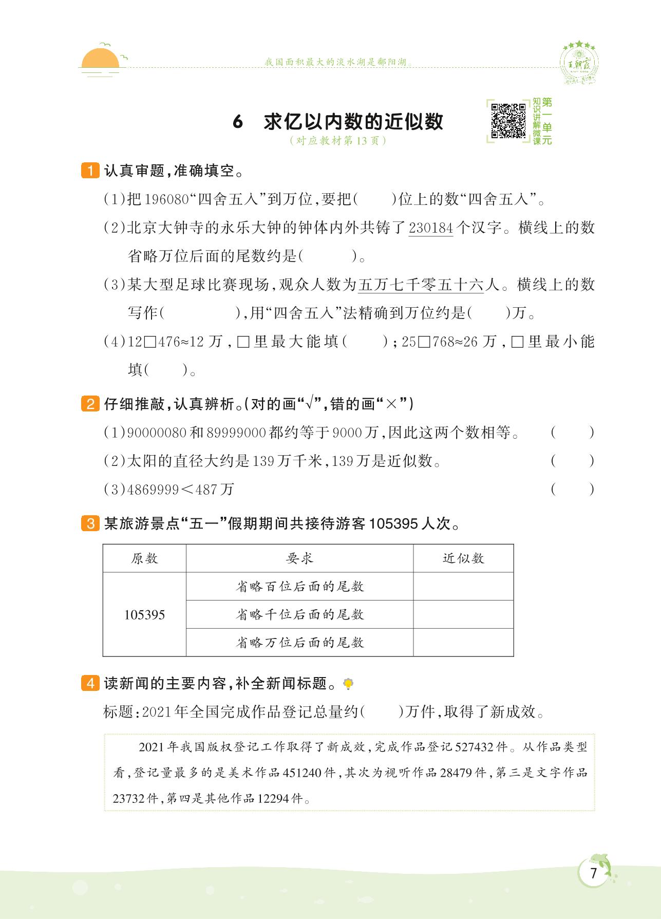 2022上册四年级数学人教版 第一单元 大数的认识——6 求亿以内数的近似数
