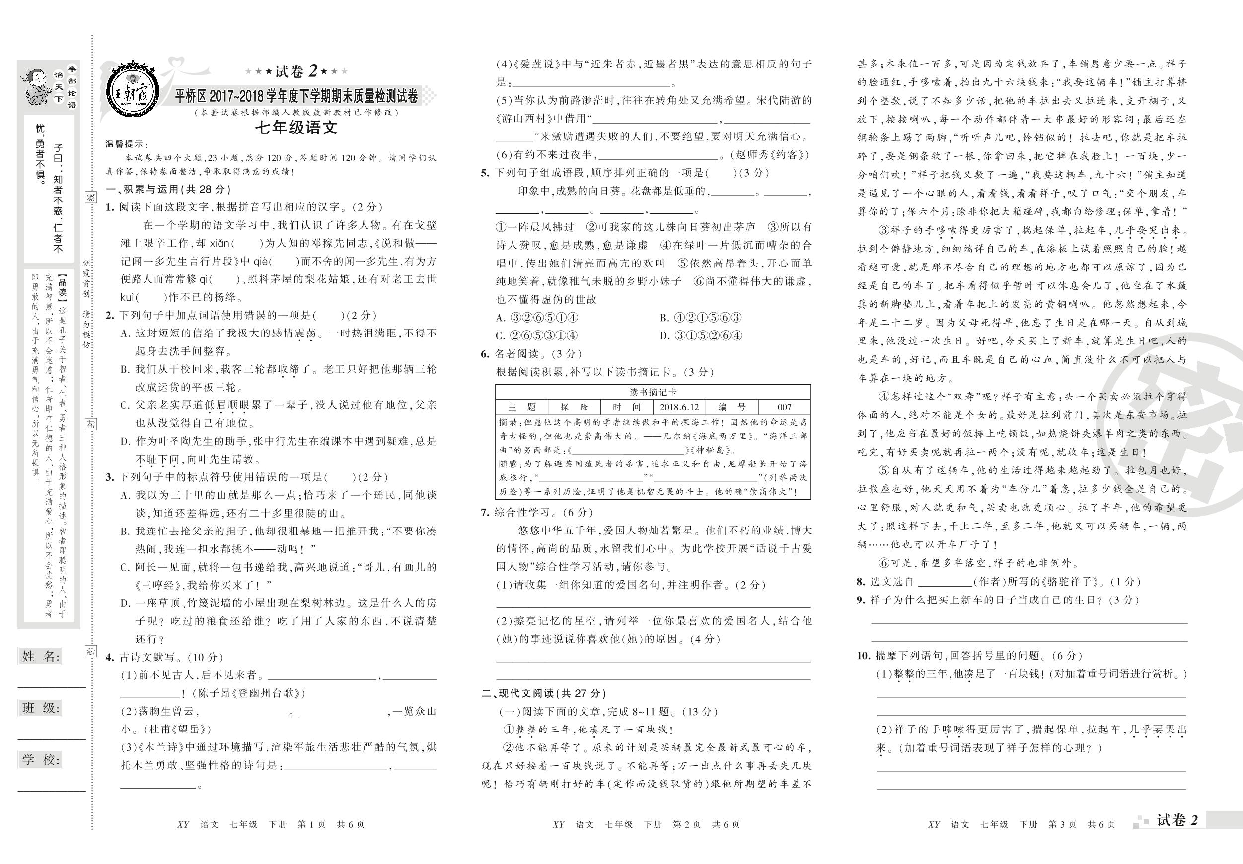 2017-2018学年第二学期信阳市平桥区七年级语文试卷(人教版)【2】