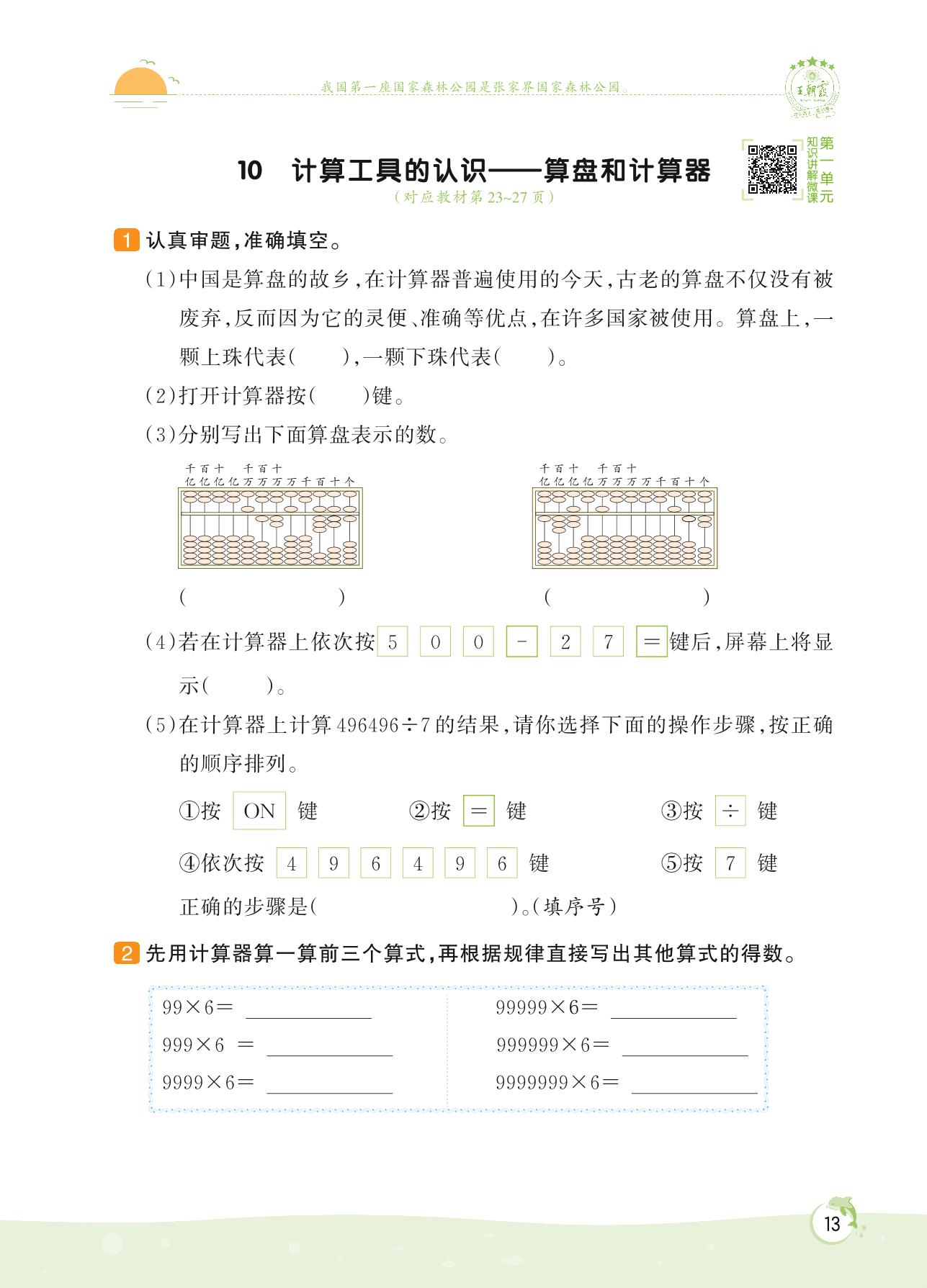 2022上册四年级数学人教版 第一单元 大数的认识——10 计算工具的认识 算盘和计算器
