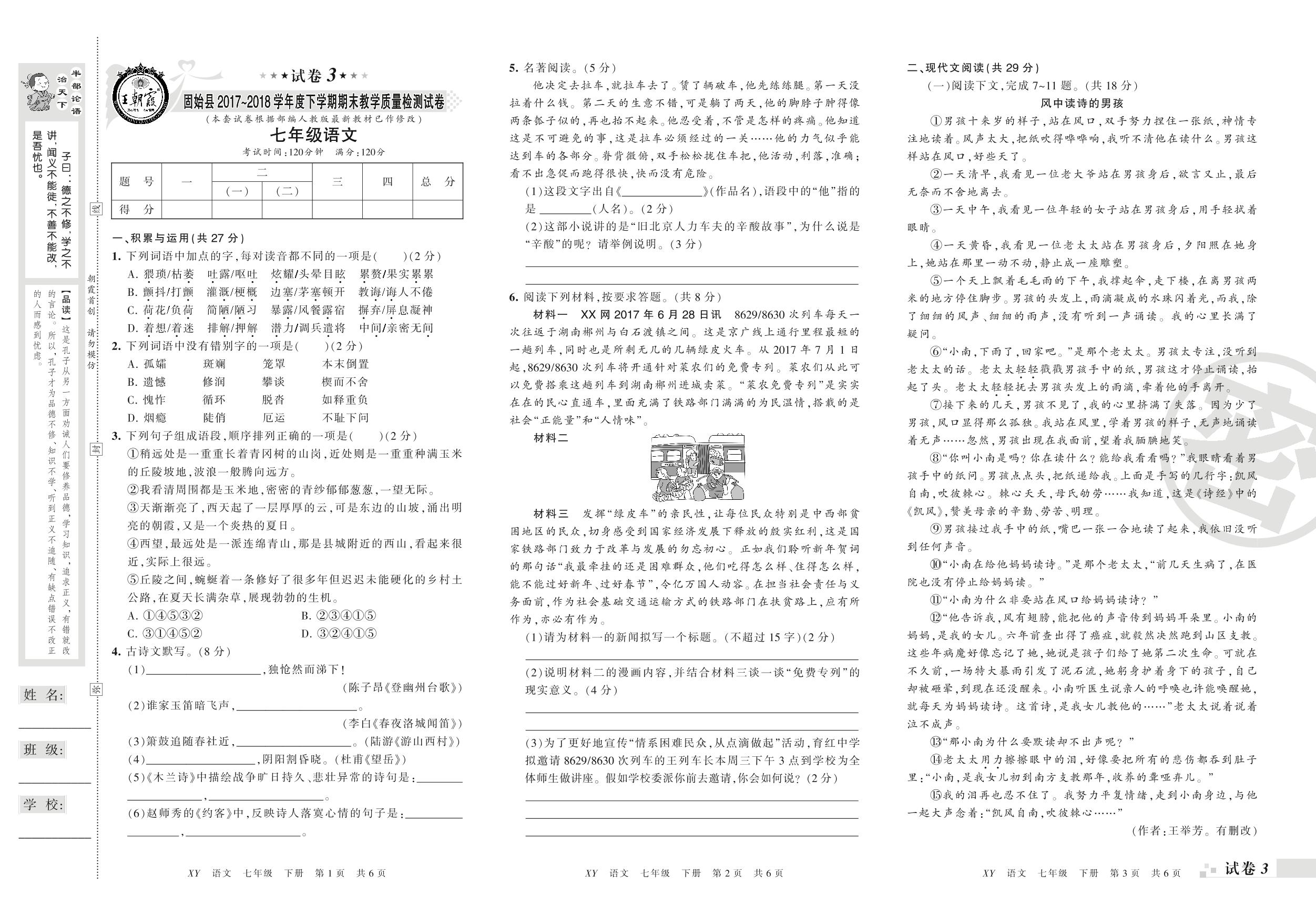 2017-2018学年第二学期信阳市固始县七年级语文试卷(人教版)【3】