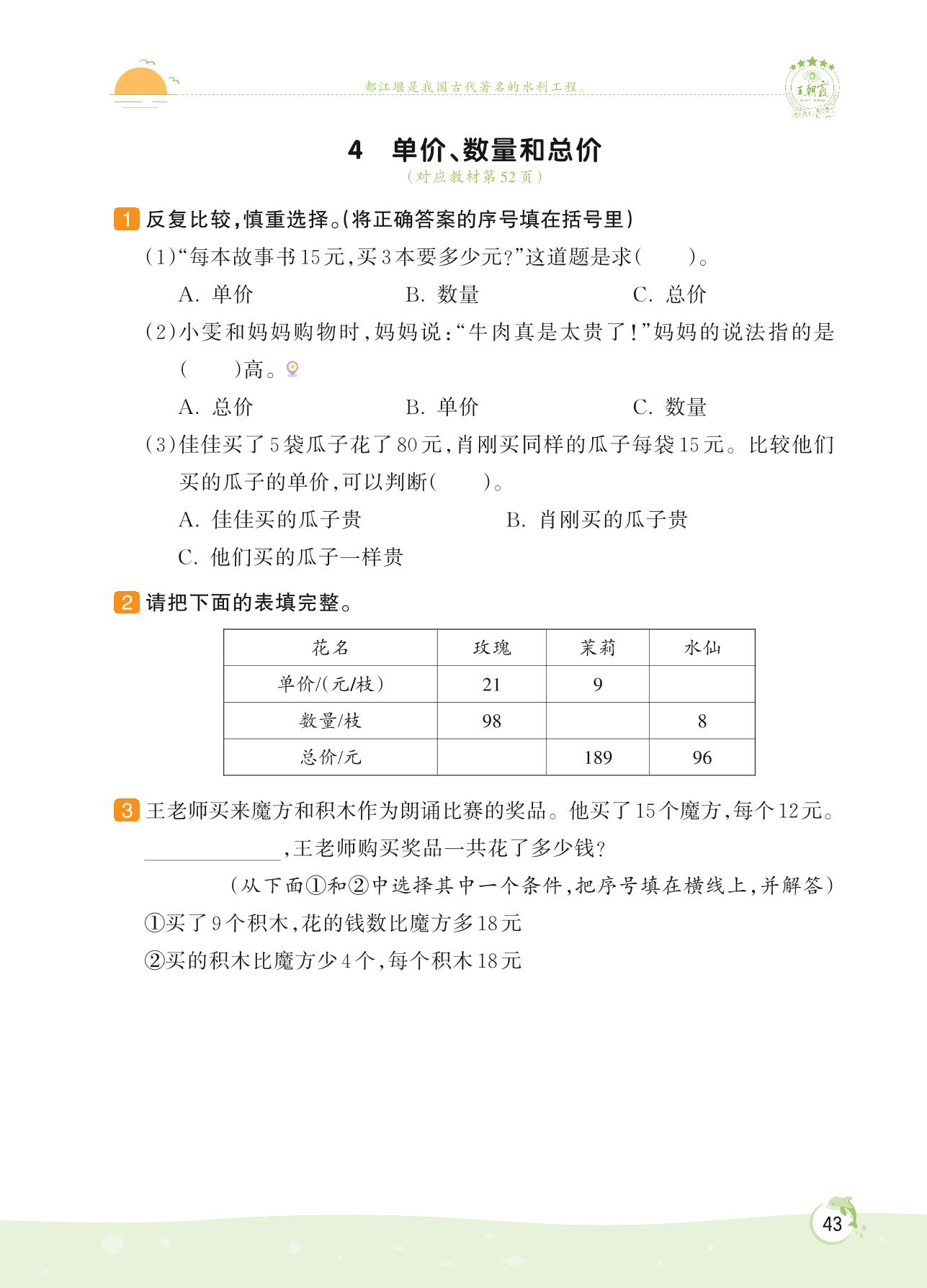 2022上册四年级数学人教版 第四单元 三位数乘两位数——4 单价、数量和总价