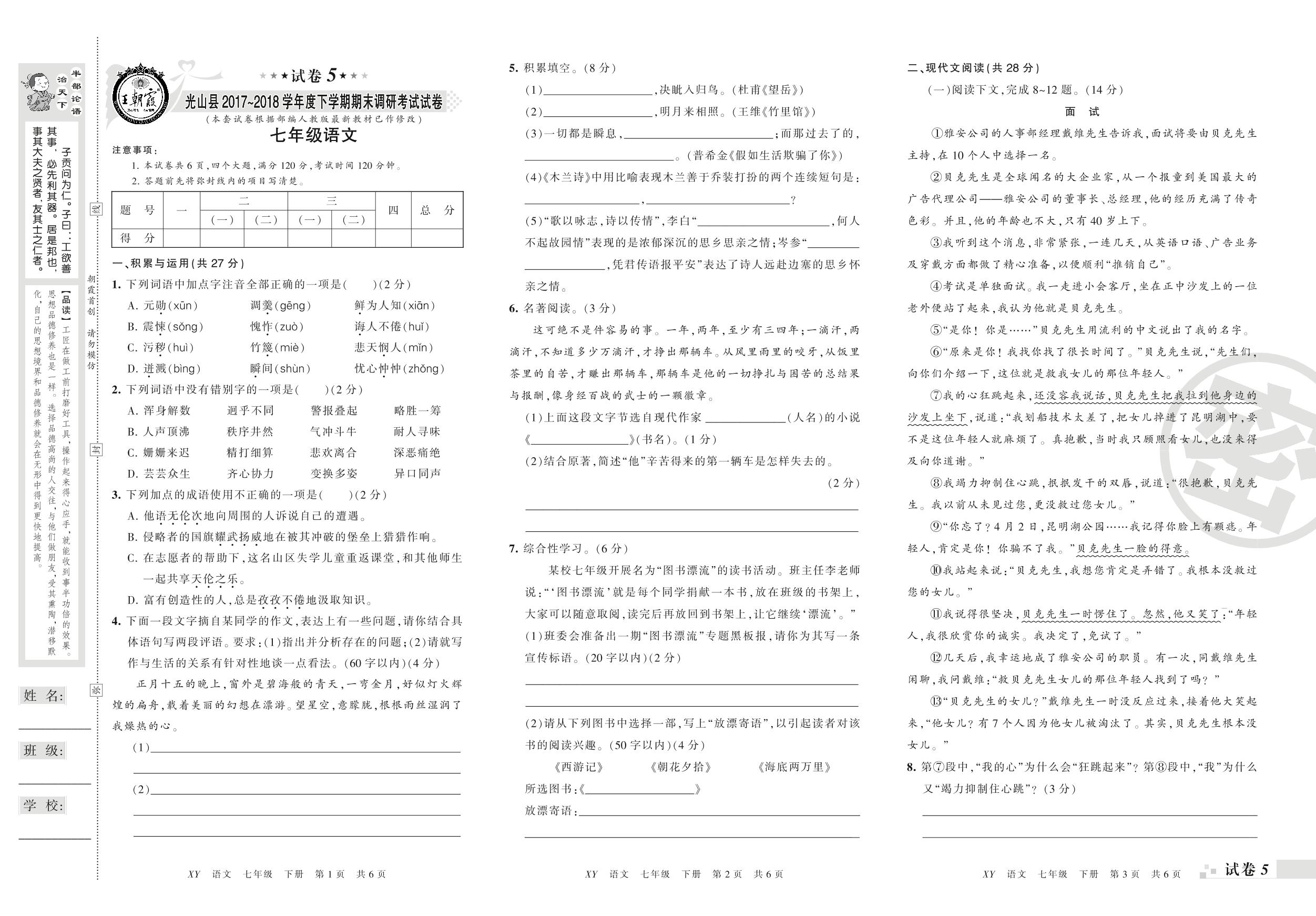 2017-2018学年第二学期信阳市光山县七年级语文试卷(人教版)【5】