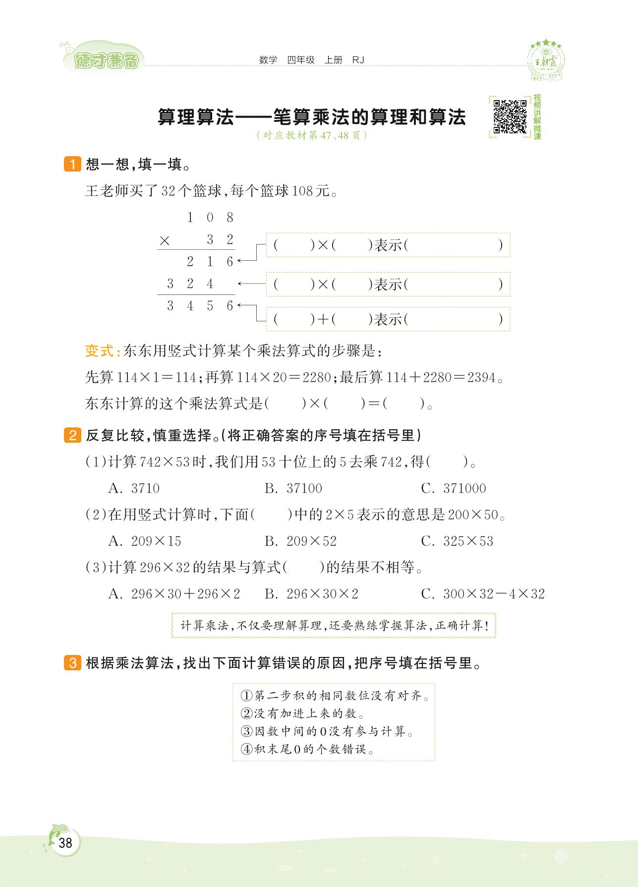 2022上册四年级数学人教版 第四单元 三位数乘两位数——算理算法 笔算乘法的算理和算法