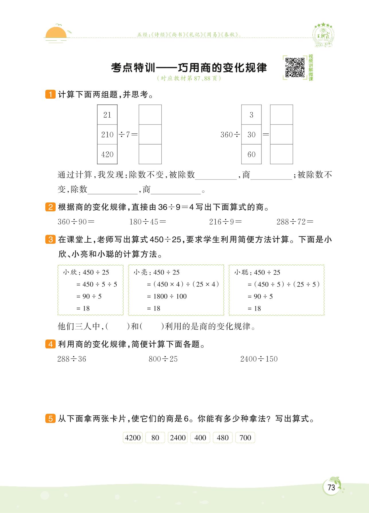 2022上册四年级数学人教版 第六单元 除数是两位数的除法——考点特训 巧用商的变化规律