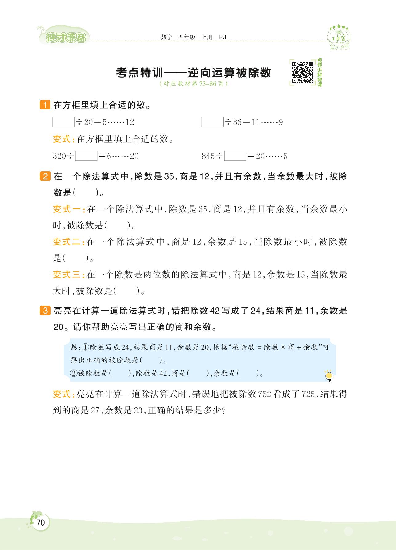 2022上册四年级数学人教版 第六单元 除数是两位数的除法——考点特训 逆向运算被除数