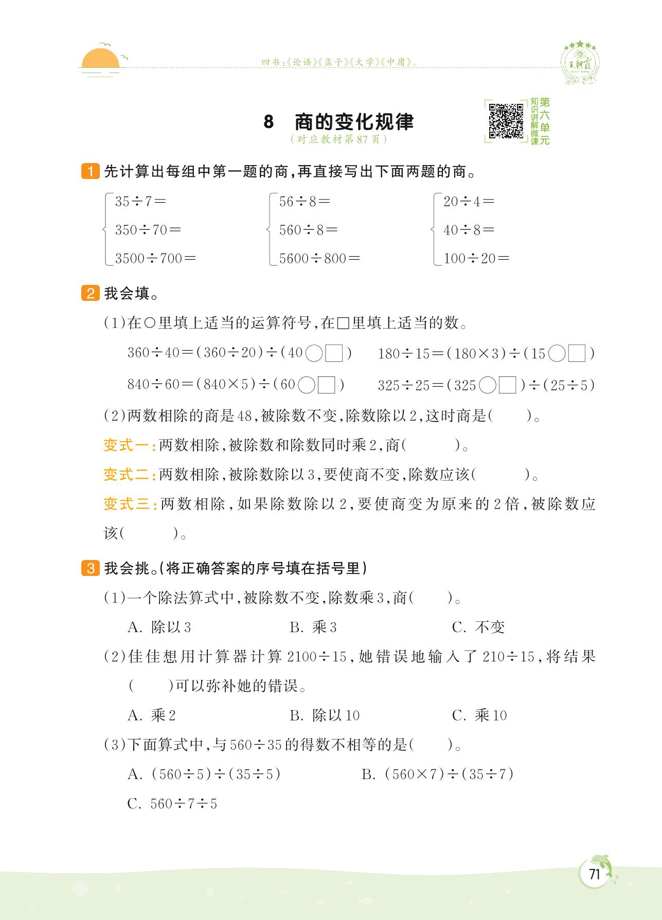 2022上册四年级数学人教版 第六单元 除数是两位数的除法——8 商的变化规律