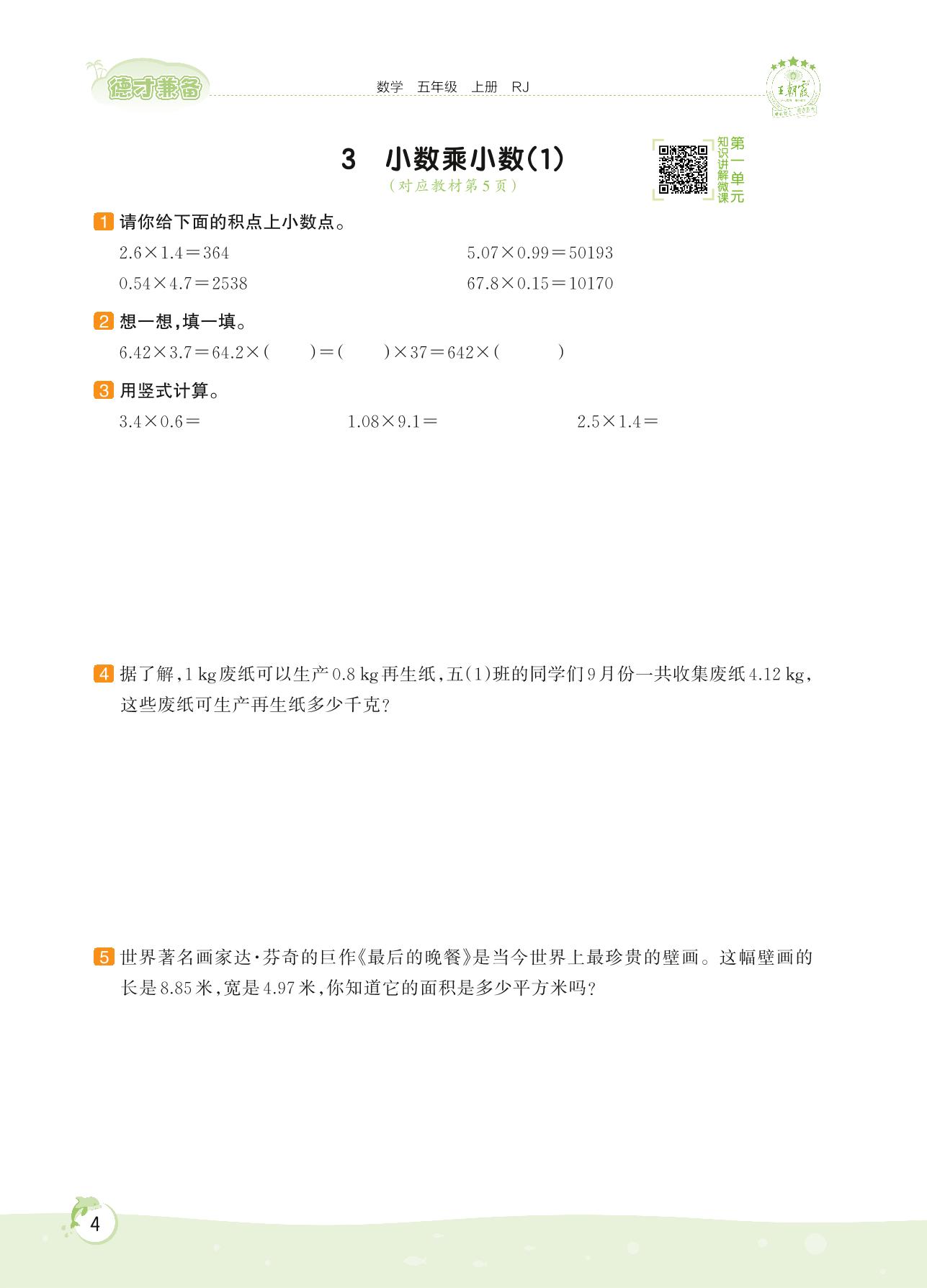 2022上册五年级数学人教版 第一单元 小数乘法——3 小数乘小数(1)