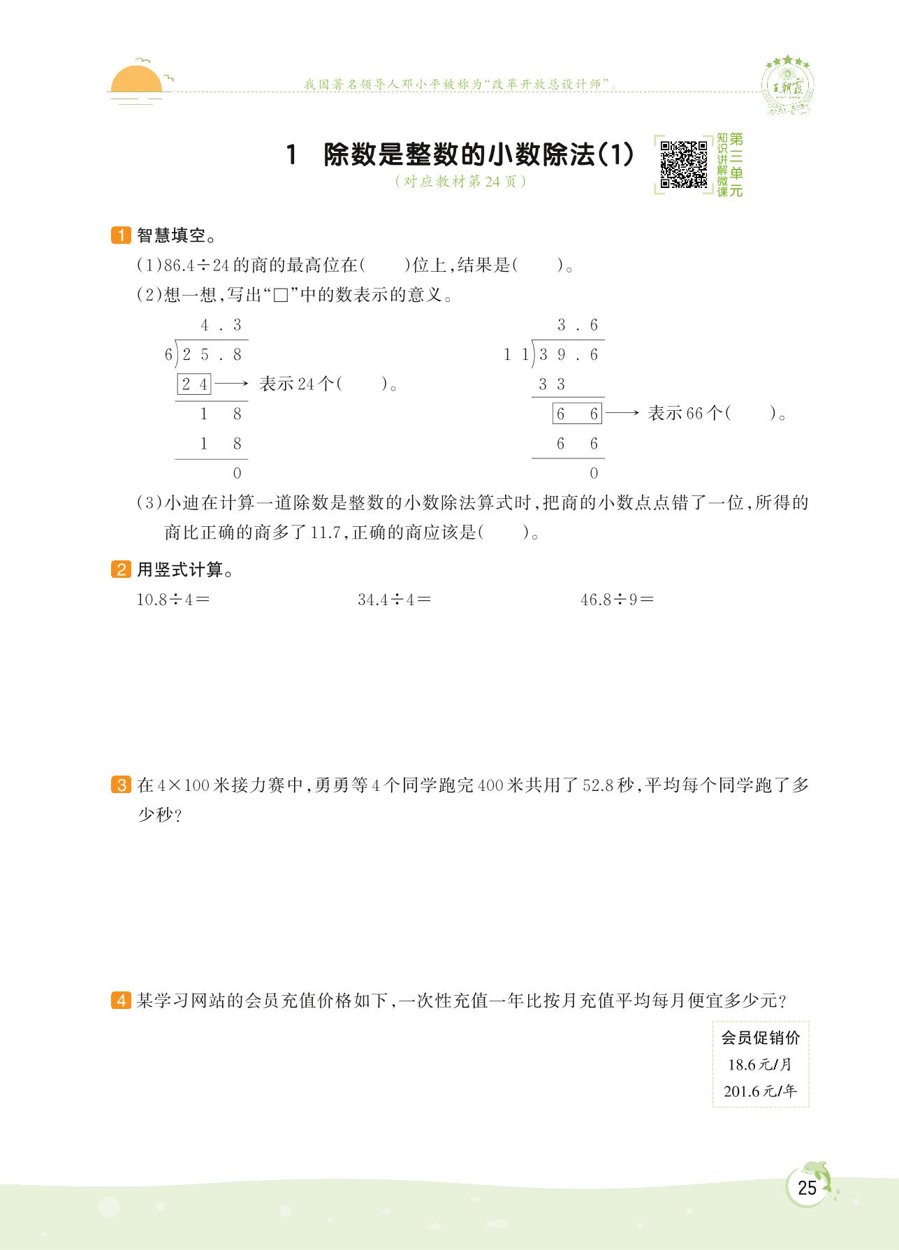2022上册五年级数学人教版 第三单元 小数除法——1 除数是整数的小数除法(1)