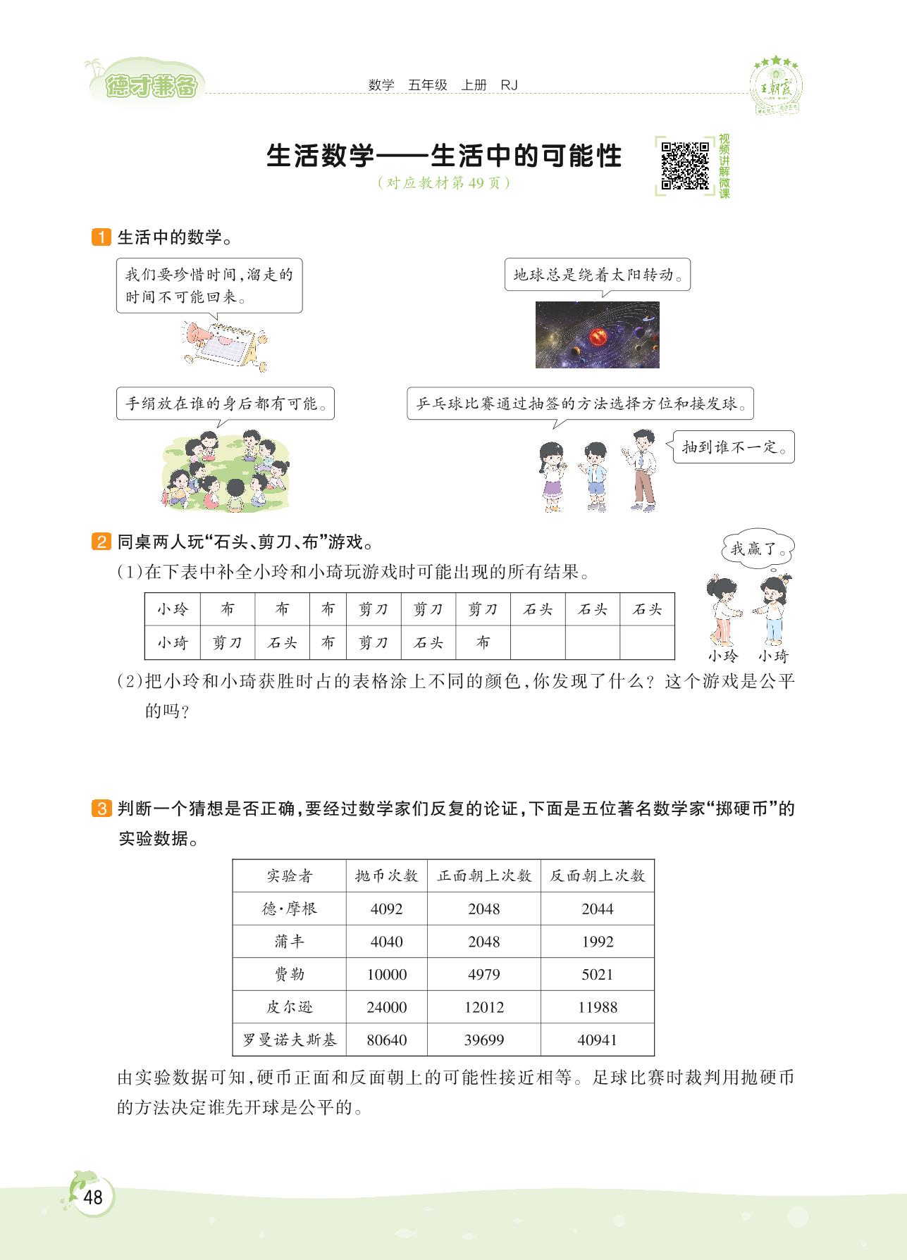 2022上册五年级数学人教版 第四单元 可能性——生活数学 生活中的可能性
