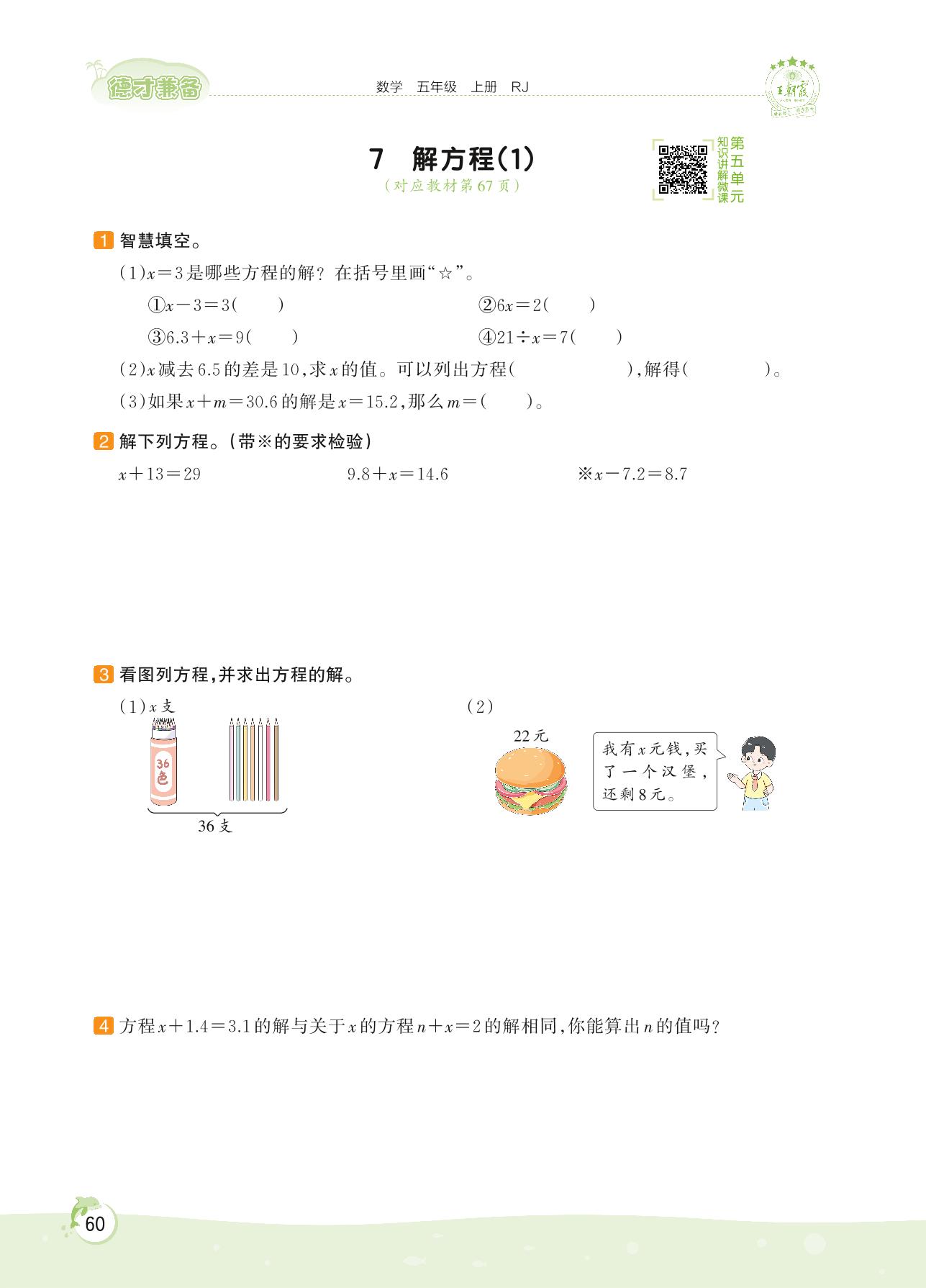 2022上册五年级数学人教版 第五单元 简易方程——7 解方程(1)