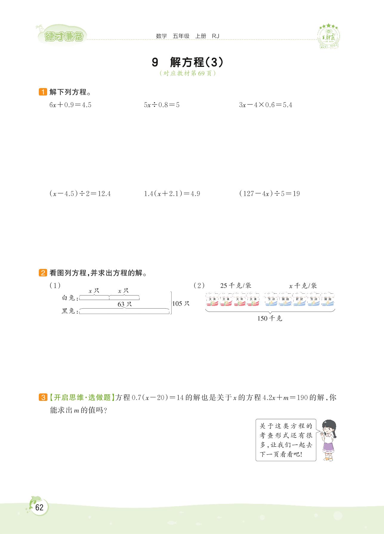 2022上册五年级数学人教版 第五单元 简易方程——9 解方程(3)