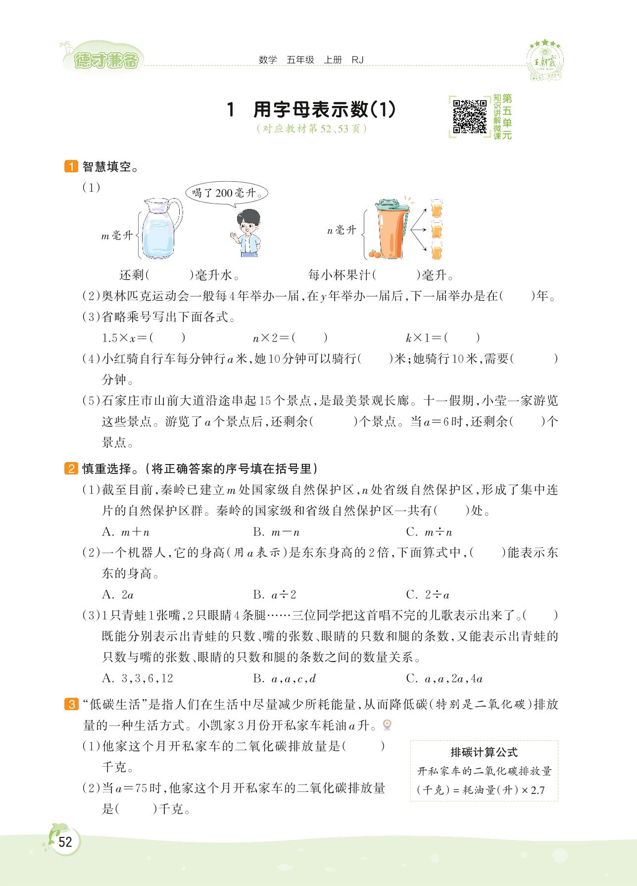 2022上册五年级数学人教版 第五单元 简易方程——1 用字母表示数(1)