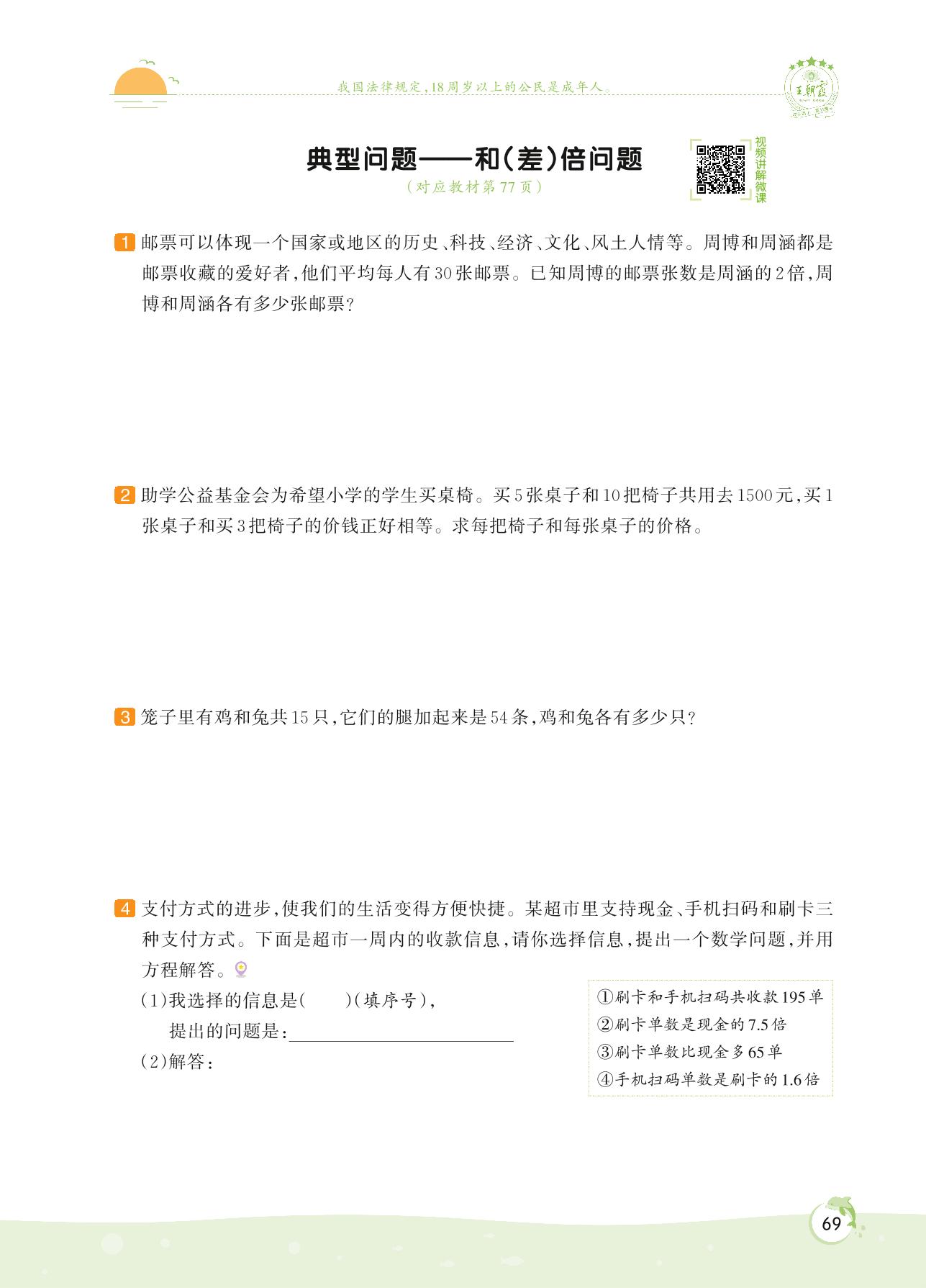2022上册五年级数学人教版 第五单元 简易方程——典型问题 和(差)倍问题