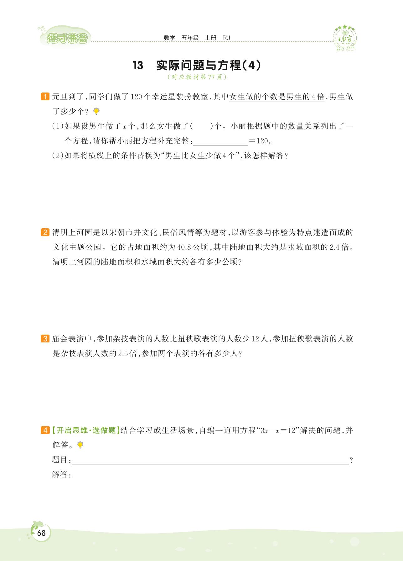 2022上册五年级数学人教版 第五单元 简易方程——13 实际问题与方程(4)